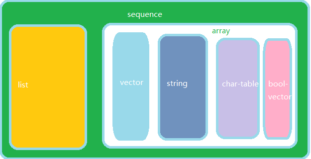 elisp 中的数组包括向量、字符串、char-table 和布尔向量,它们的关系如下: