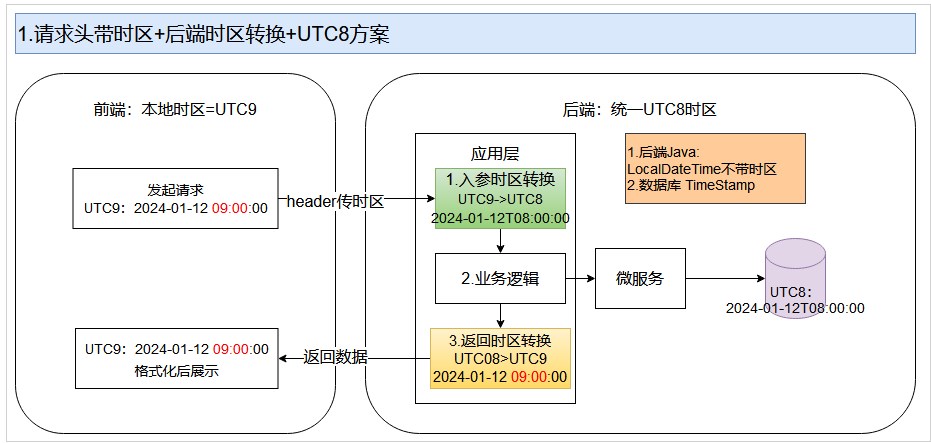 - 后端:请求到后端时,在入参解析时,框架根据header中的timezone(缓存本地),转换成UTC8时区时间。(图中UTC9→UTC8)