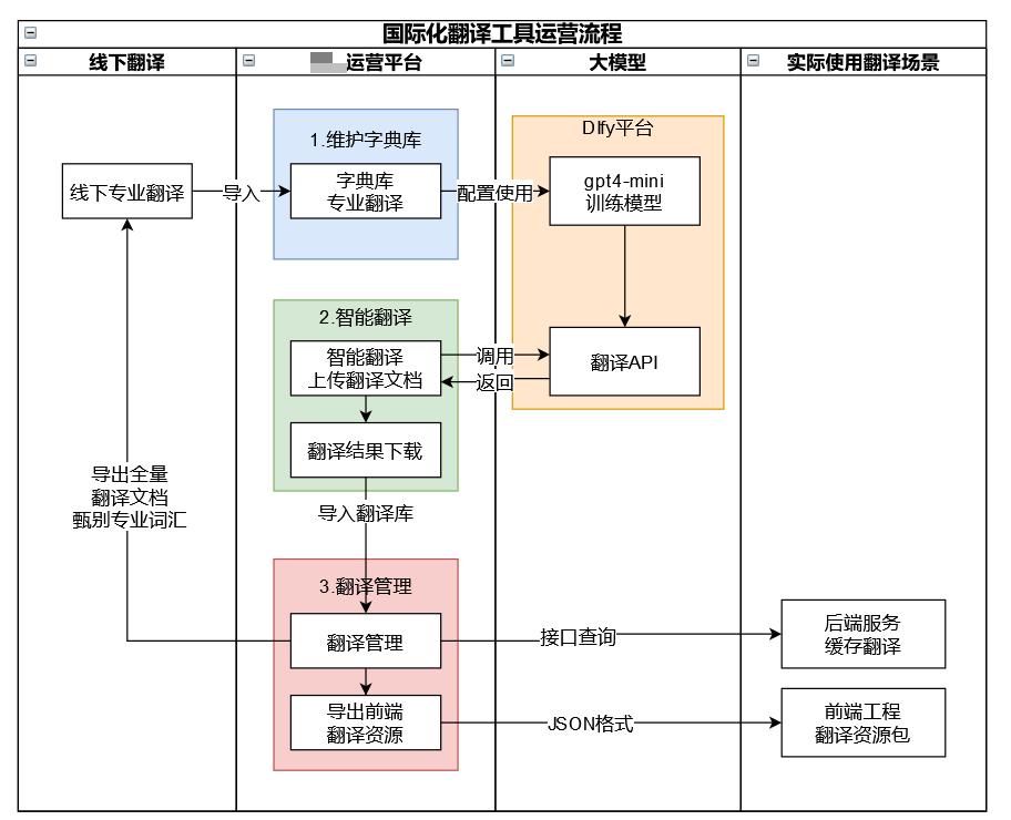 - 3.翻译管理:把智能翻译的结果下载,完事人工检查一下本次翻译的变化列,校验无误后导入翻译管理,即可被业务使用,支持可视化维护。流程如下图: