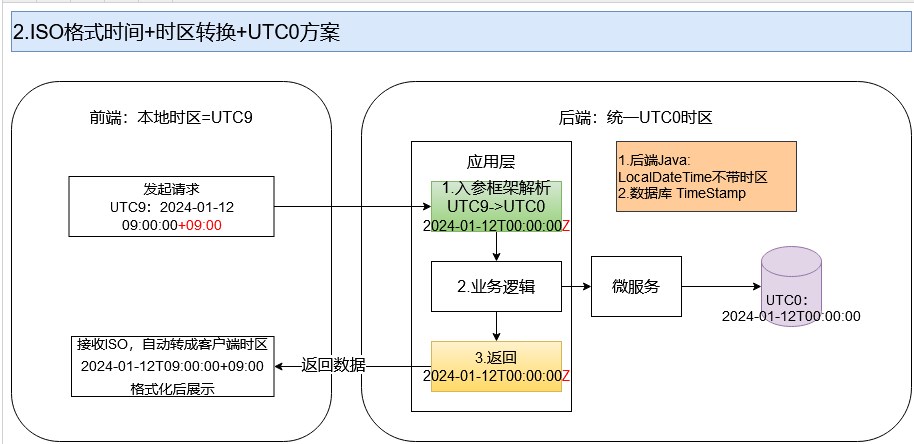 - 后端:请求到后端时,在入参接收时,框架把本地时区时间转换为系统默认时区(UTC0)的时间。(图中UTC9→UTC0)