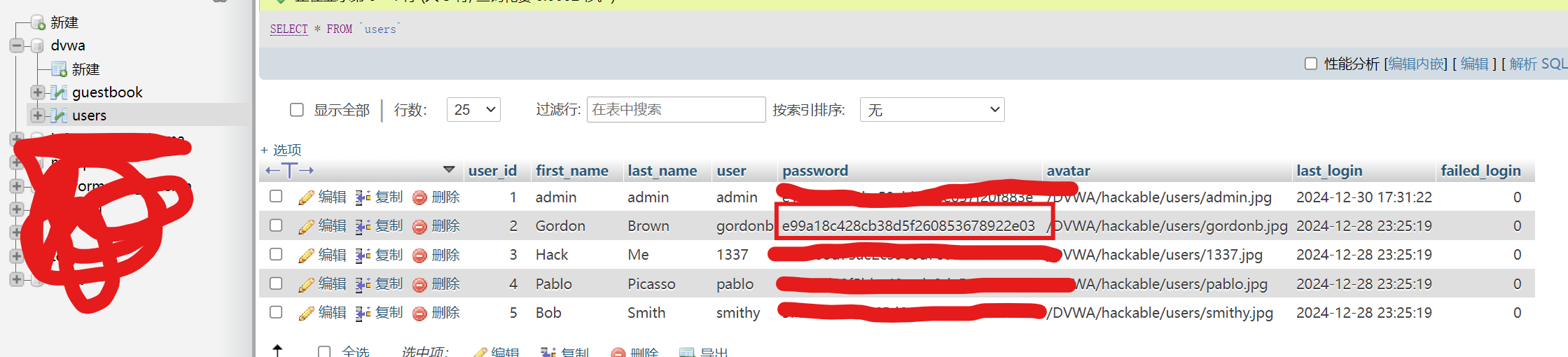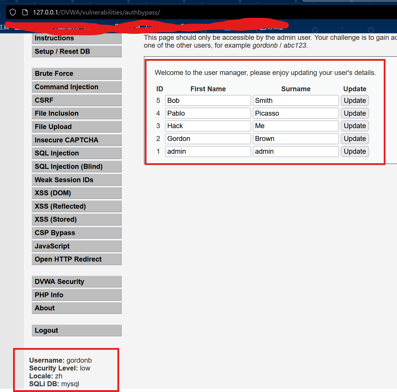 先使用管理员登录,然后记住下面的数据库以及路径 vulnerabilities/authbypass