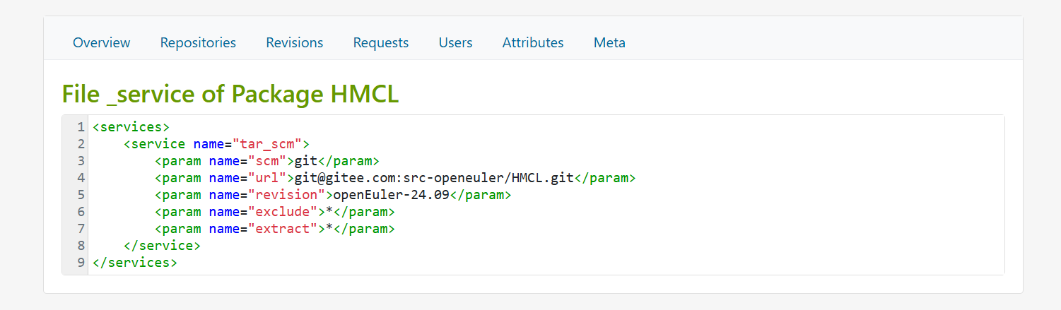 Show openEuler:24.09 / HMCL – 开源软件构建与测试。在这个网站里,可以看到有好几个文件,这些都跟HMCL打包有关。 第一个是_service文件,这个文件用于从特定仓库里面拉取代码文件到当前平台,可以看见每个文件都有特定前缀,这些都是拉取过来之后平台自动加的。
