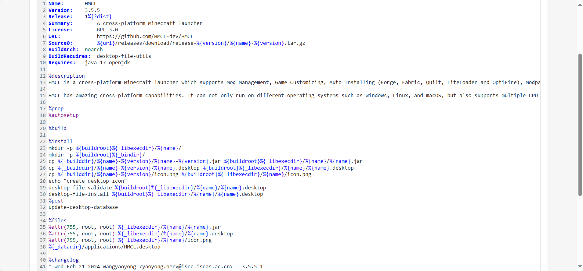 另外,编写spec文件过程运用到了大量的宏,这样可以保证跨平台性,在openEuler 24.09的仓库当中,HMCL的打包算是比较简洁的了,恰好MC又是一款有趣的游戏,打包也简单。