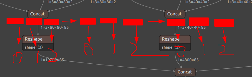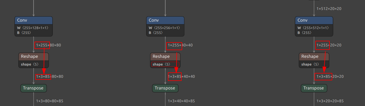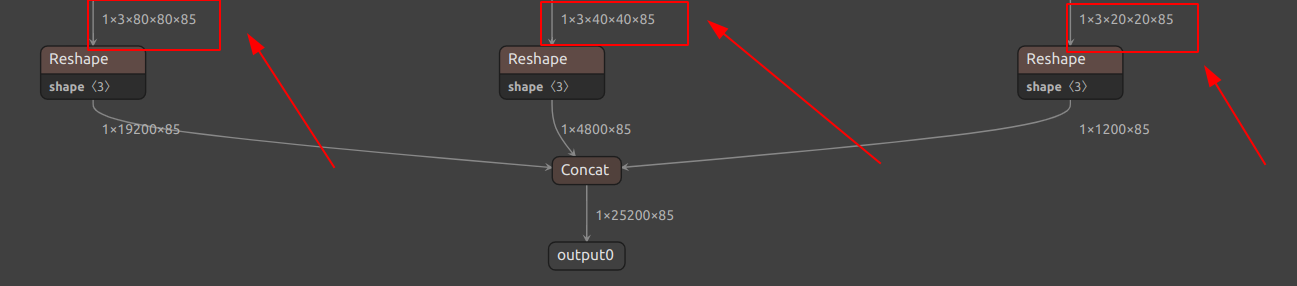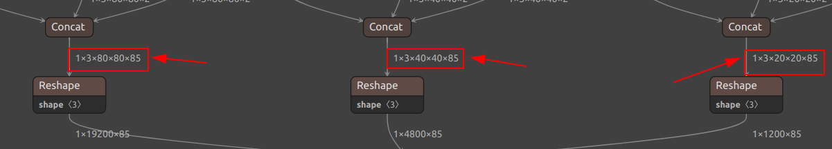 不难看出最后的输出是由三部分合起来的。第一部分为(1×3×80×80×85),根据前面的概念,这个组成正好是\((batchSize × anchorBox数量 × 特征图大小 × 特征图大小 × 85)\),组成。这个85便是每个锚框的信息,其中80为类别信息,4为坐标信息,1为置信度信息,其构成便是\((5 + 类别信息)\)