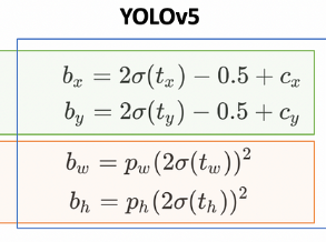 其中\(t_{x}, t_{y}以及t_{w}, t_{h}\)为预测数据也就是原始的输出数据,\(c_{x}, c_{y}\)为grid cell在原图中的左上角坐标,\(p_{w}, p_{h}\)为anchorbox的宽高,\(b_{x},b_{y},b_{w},b_{h}\)即为物体在原图中的坐标信息。其中\(\sigma()\)函数代表对数据进行sigmoid操作。