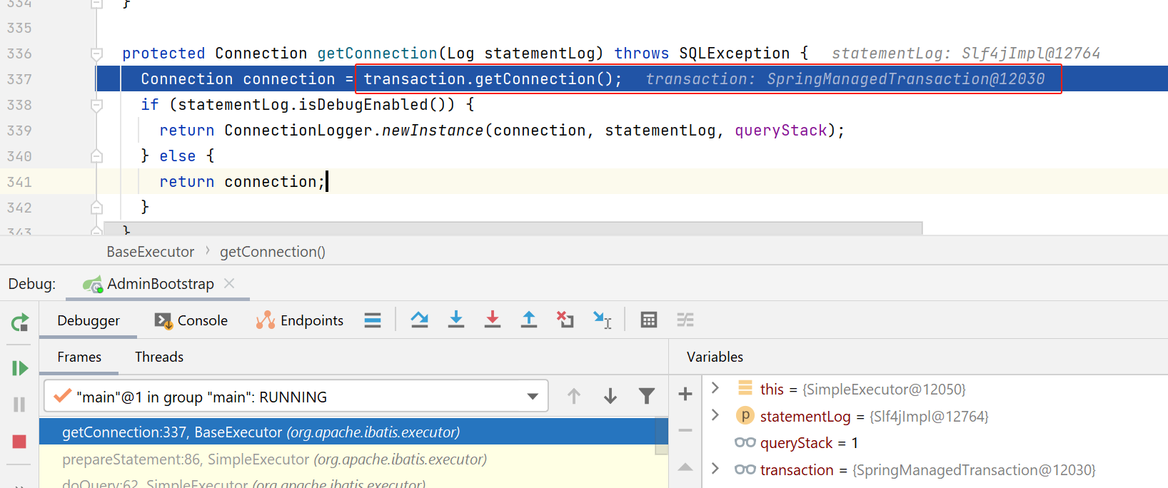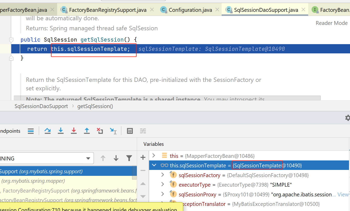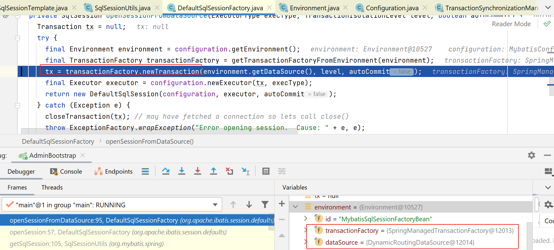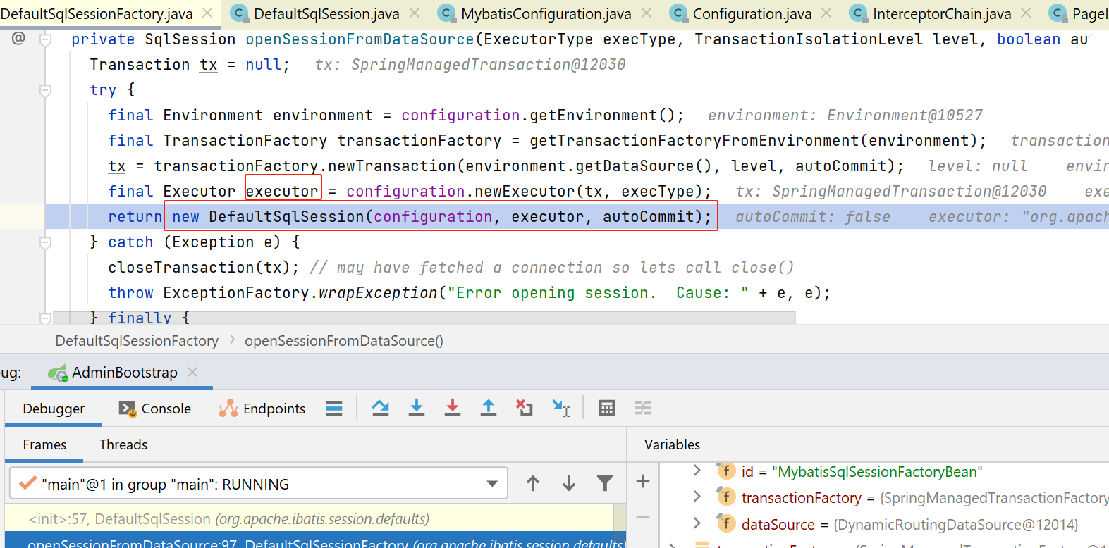这里就进入mybatis相关jar包的代码了,当前this为:DefaultSqlSessionFactory