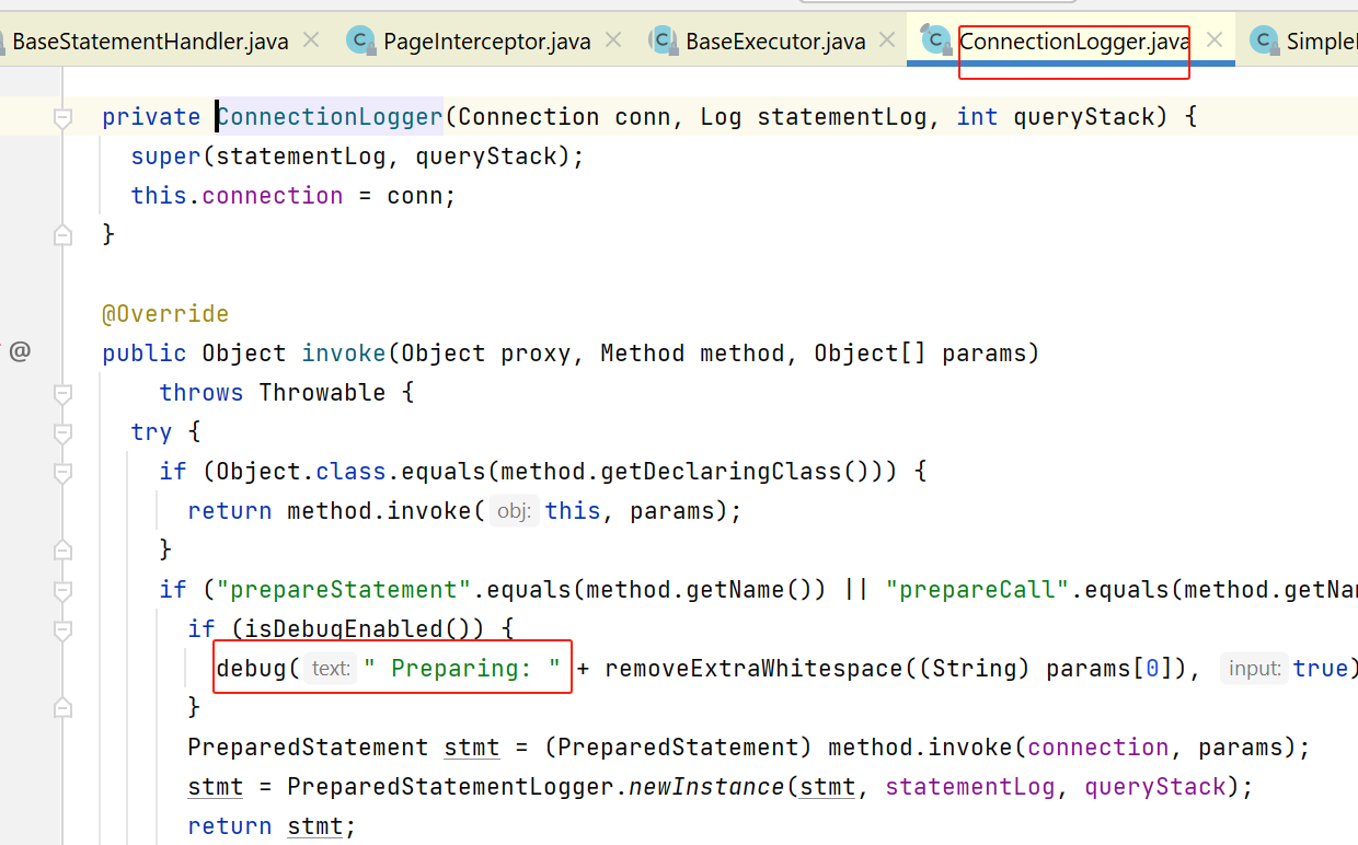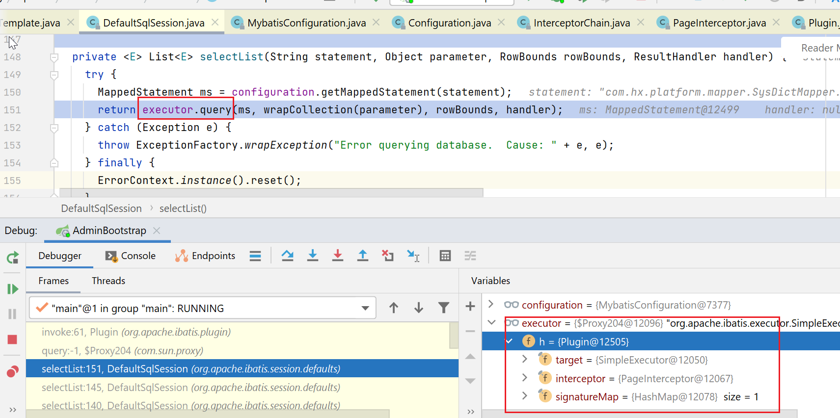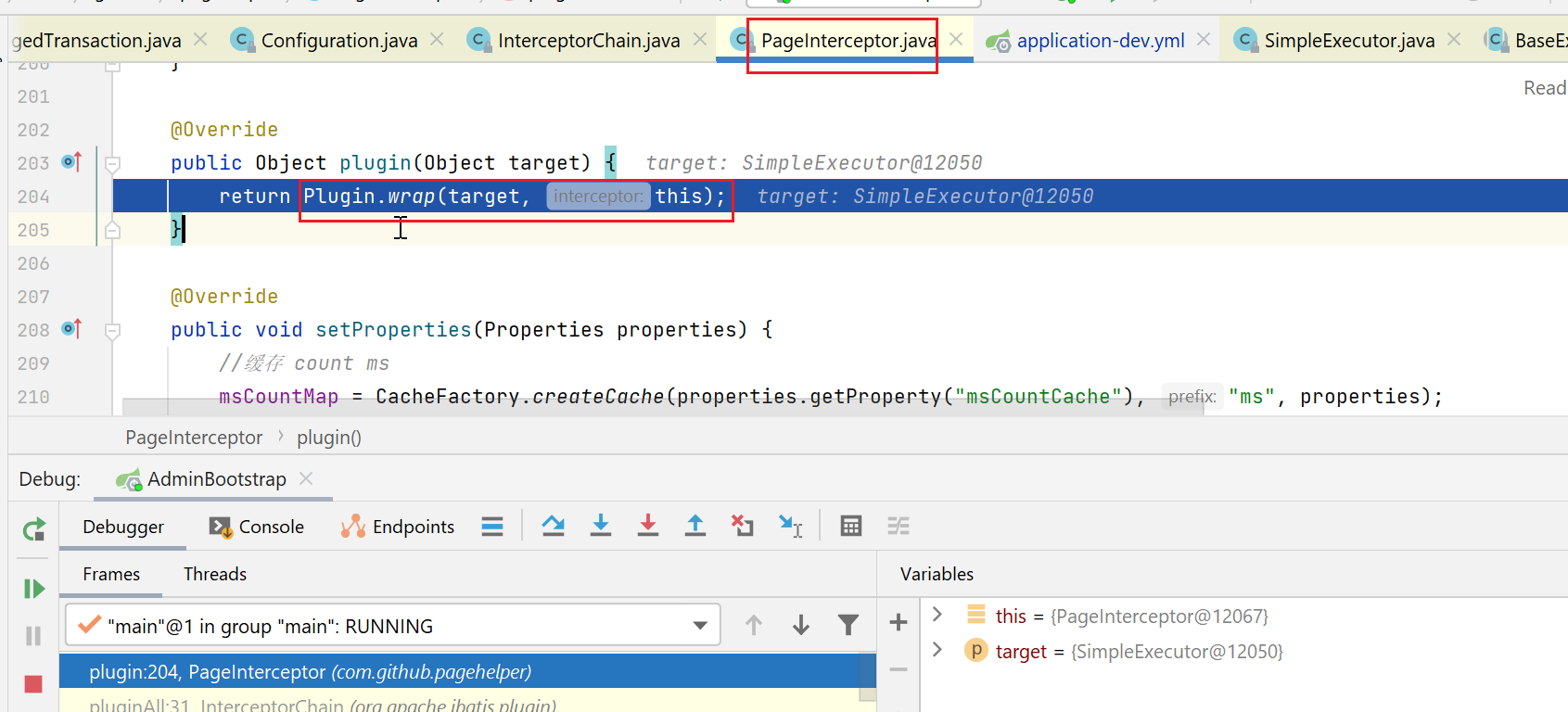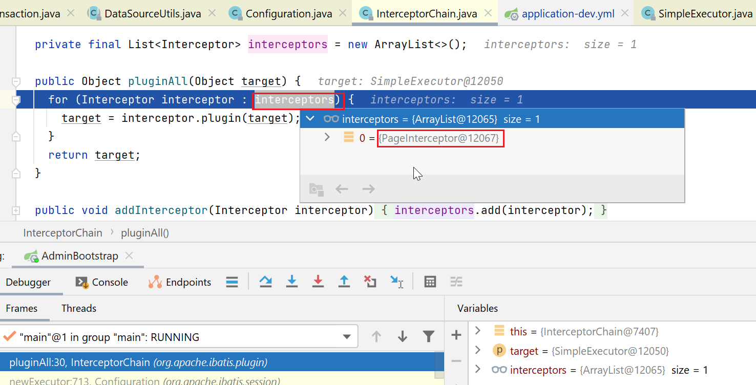 我们这里只有一个拦截器,就是分页的拦截器,target就是我们传入的SimpleExecutor。