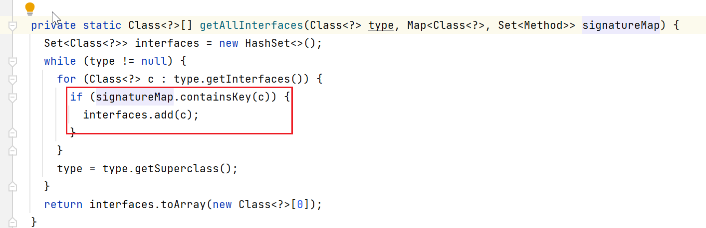 这里怎么检查target(SimpleExecutor)是否需要被拦截呢,那就检测下有没有交集就行了(看看target实现的所有接口,是否和拦截器定义的类匹配)。如下,先获取target中的接口和拦截器中接口,是否有交集: