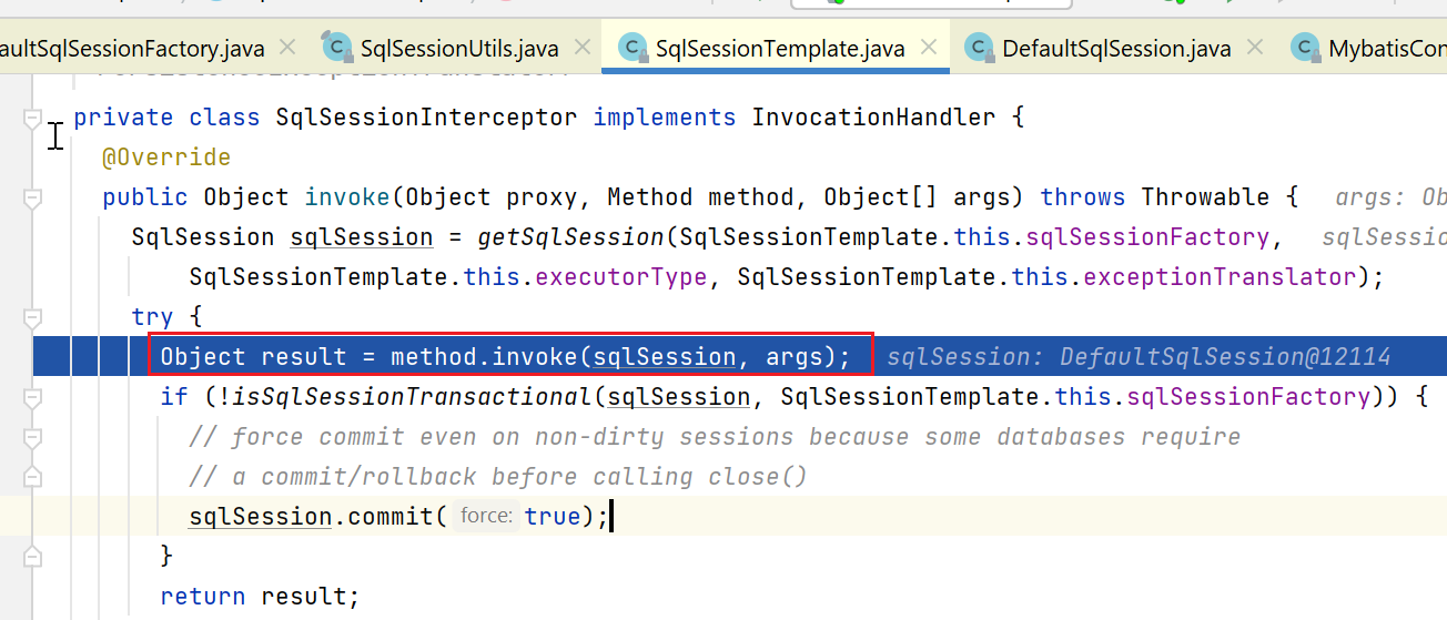 public Object invoke(Object proxy, Method method, Object[] args, SqlSession sqlSession) {