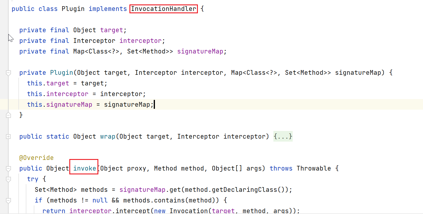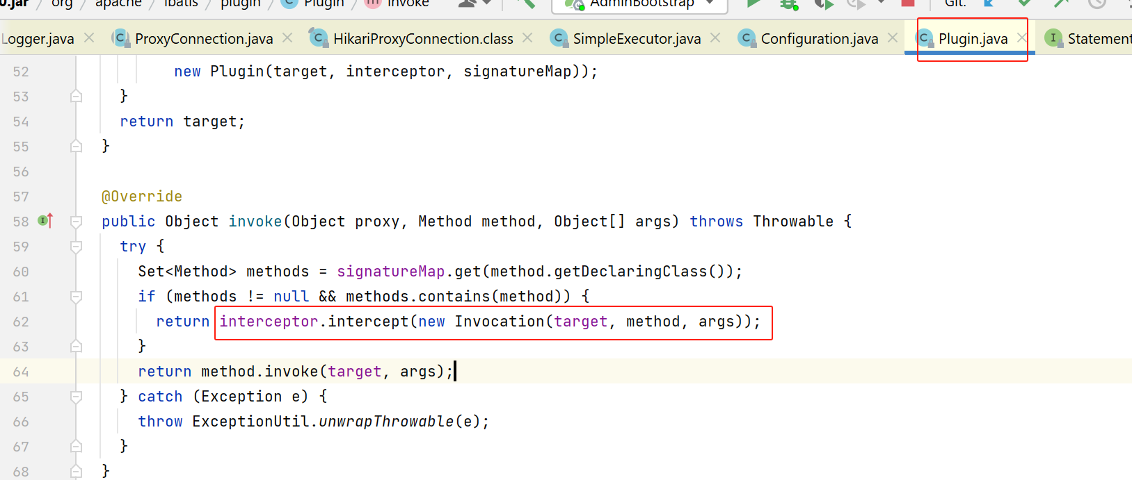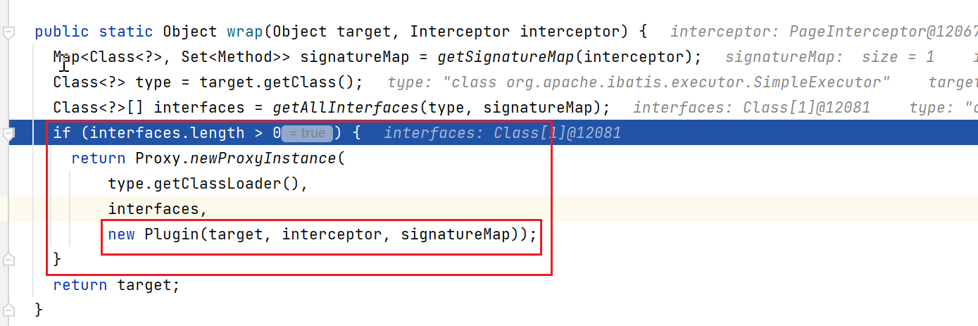 如果有交集,就会给SimpleExecutor创建代理对象,其中invocationHandler的类型就是Plugin类型:
