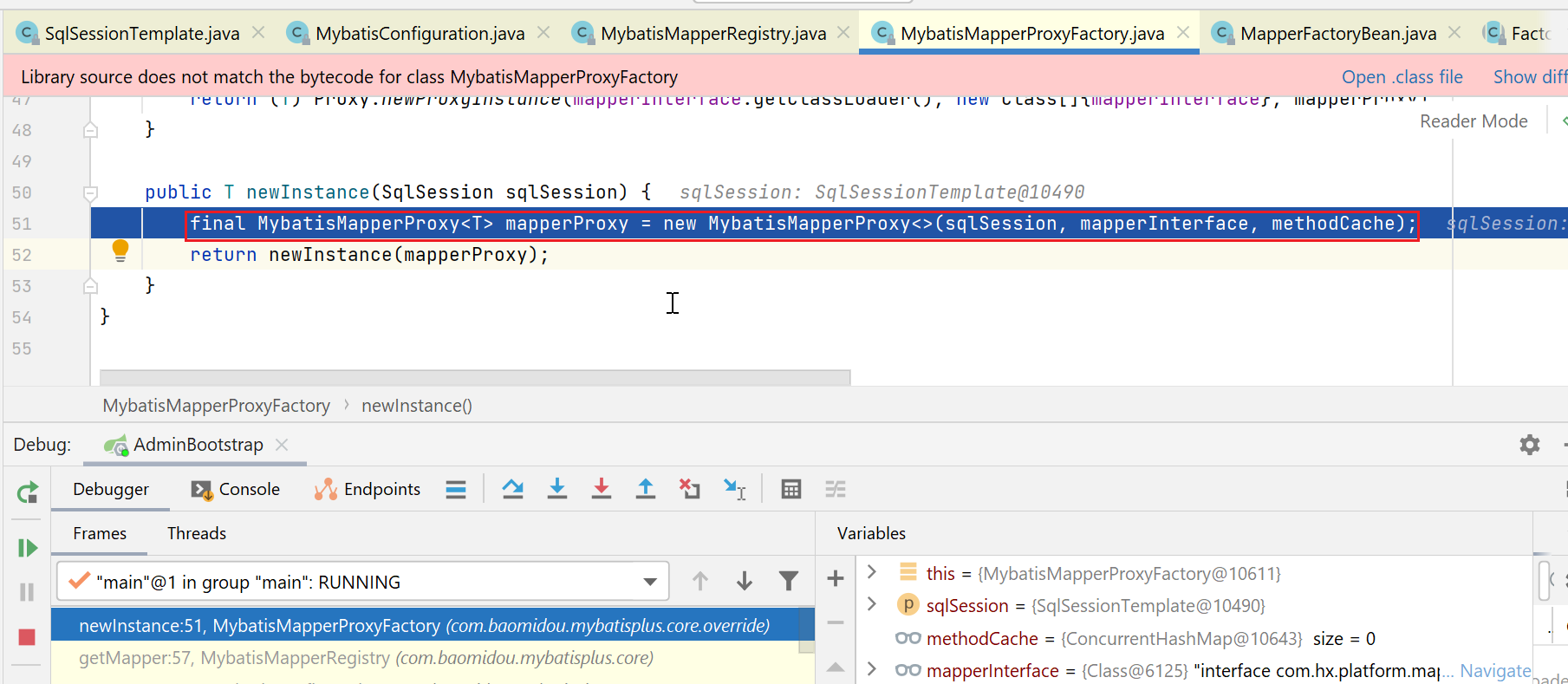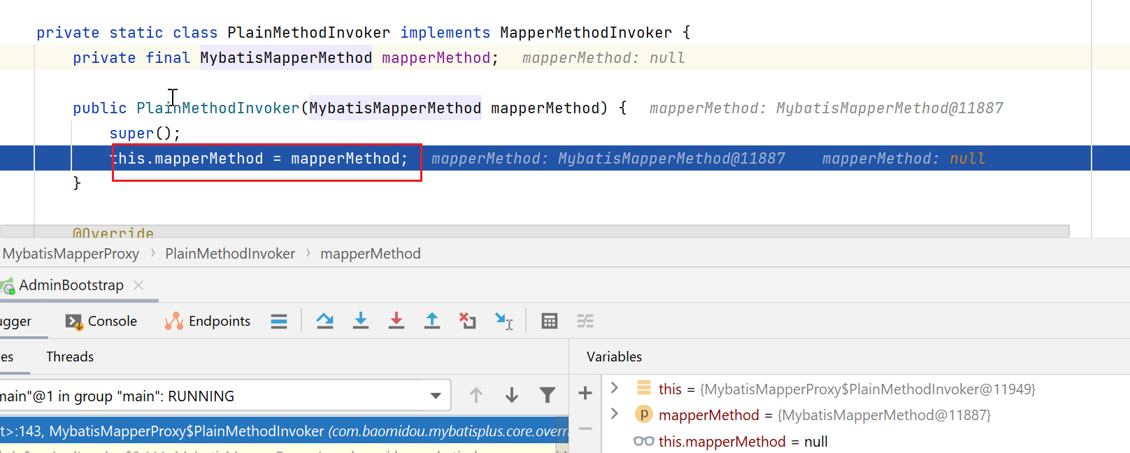 所以,最终构造的mapper,就是下面这样一个动态代理对象,动态代理的处理类呢,为com.baomidou.mybatisplus.core.override.MybatisMapperProxy类型,里面包含了两个field: