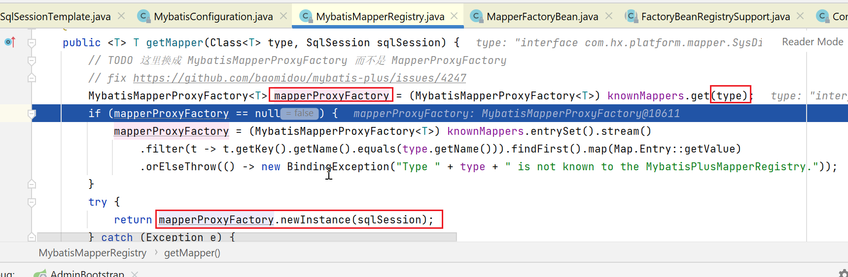 接下来就是调用com.baomidou.mybatisplus.core.MybatisConfiguration的getMapper方法: