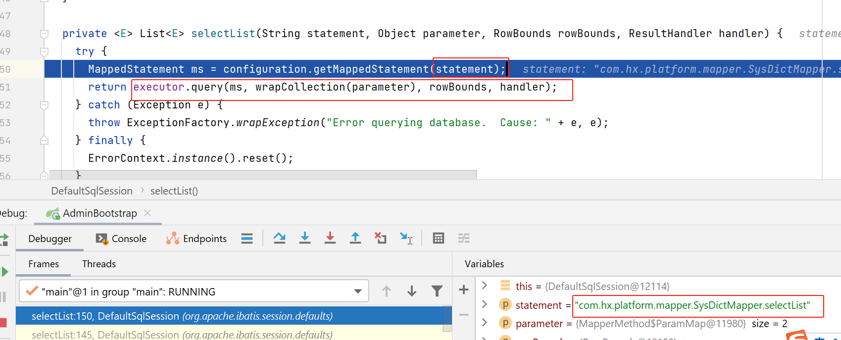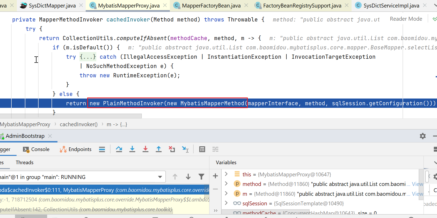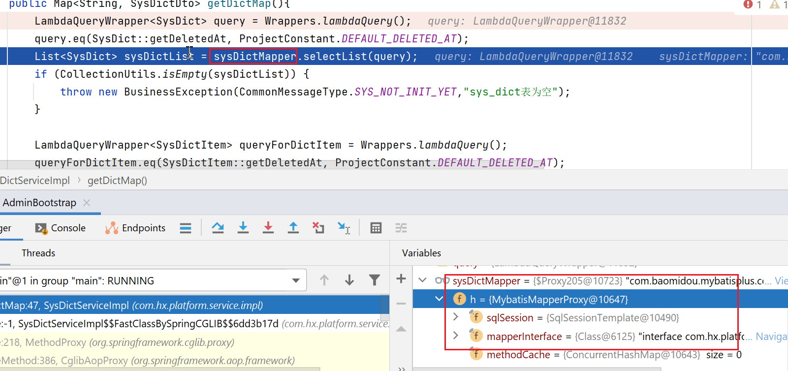 以下图举例,这里会执行一个sysDictMapper.selectList方法: