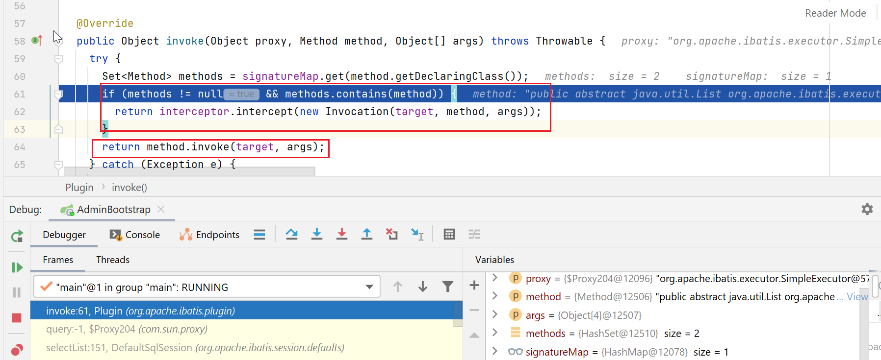 由于Executor被代理了,这里就会跳转到Plugin中,判断要执行的方法,是否在拦截器链中定义了,决定是否要执行拦截器