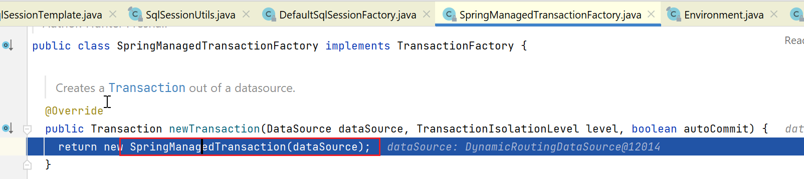 这里刚开始,获取了一个environment,注意这个不是springboot里那个environment,是myabtis里的。具体其中有啥字段,可以看上图右下角:里面包含了transactionFactory、datasource等。