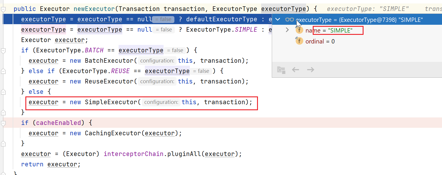 在完成SimpleExecutor的创建后,检查是否开启了cacheEnabled选项,就是mybatis的一二级缓存啥的,这个是默认开启的,我这边为了减少干扰,改了配置项,先关了。