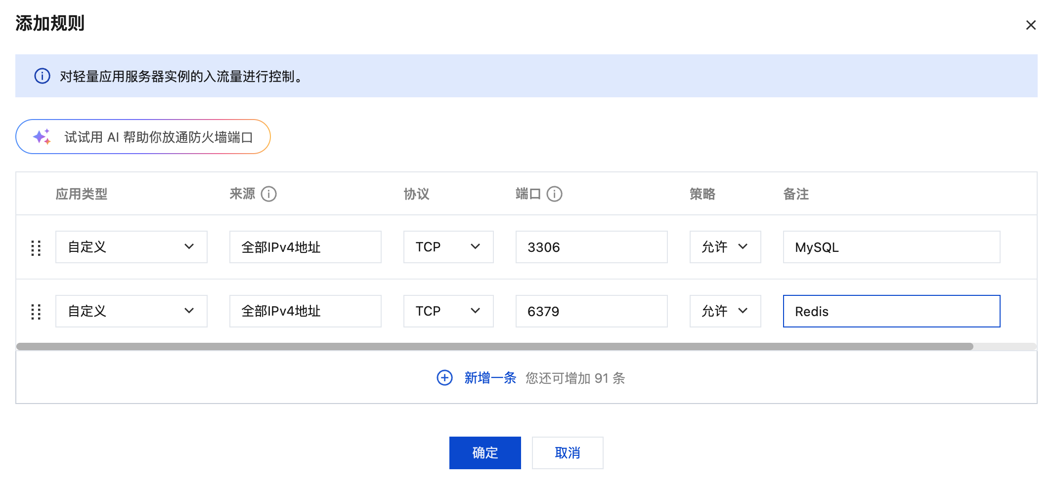 做好规划后,我们需要在腾讯云控制台的防火墙中开通需要外网访问的服务端口,比如 MySQL 和 Redis: