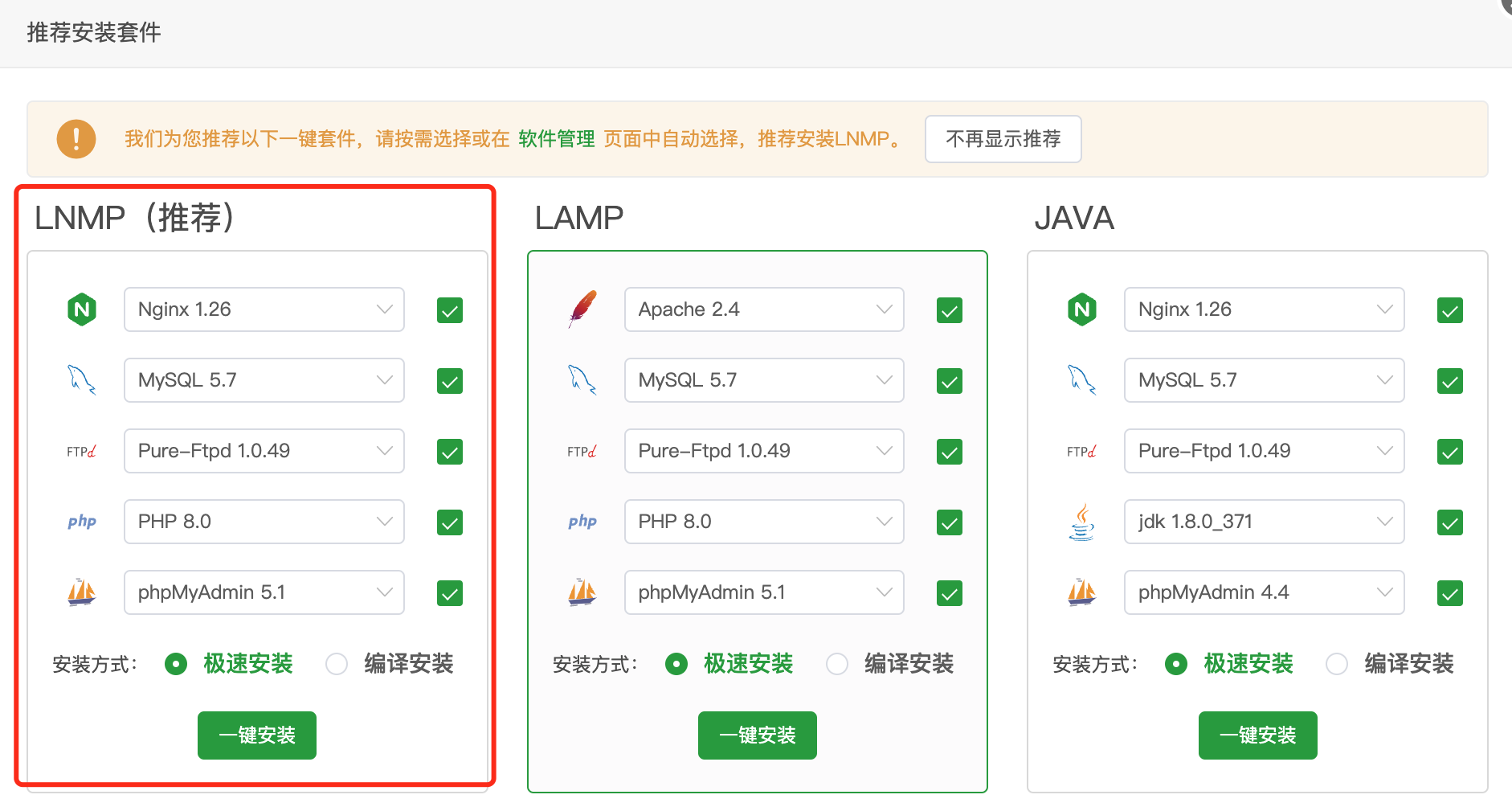 首次进入宝塔时,会提示我们安装环境,这里推荐安装 LNMP(包含 Nginx 服务器),适合部署前后端分离的项目: