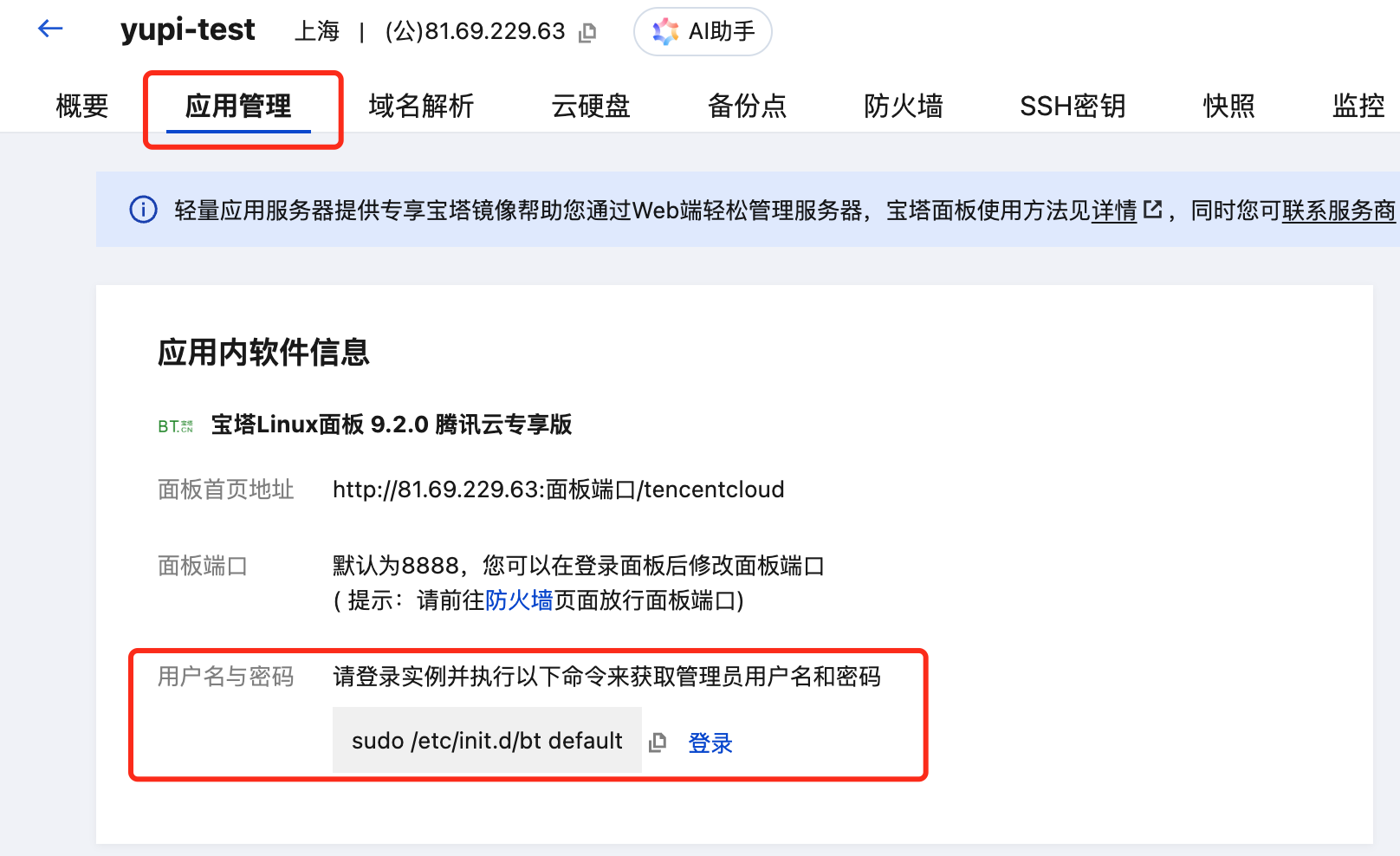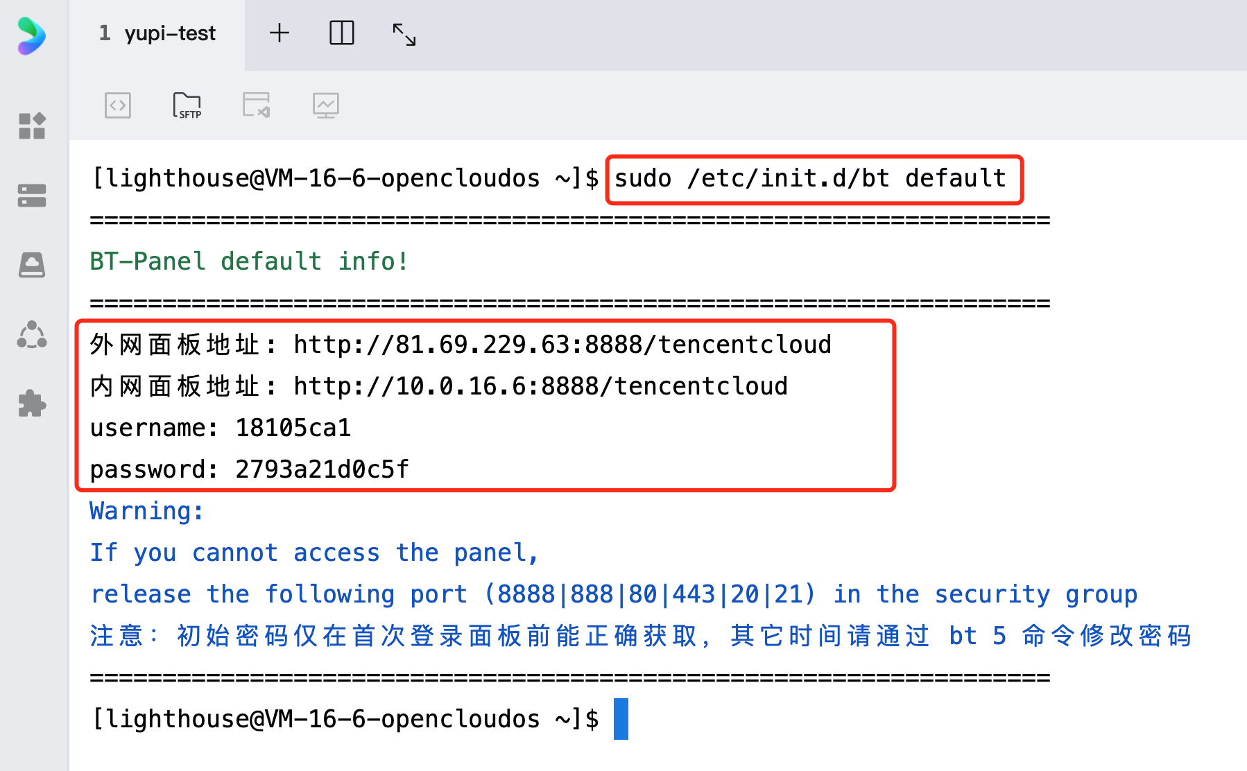 首次登录时,需要先登录服务器,通过输入命令的方式获取宝塔默认账号密码,如图: