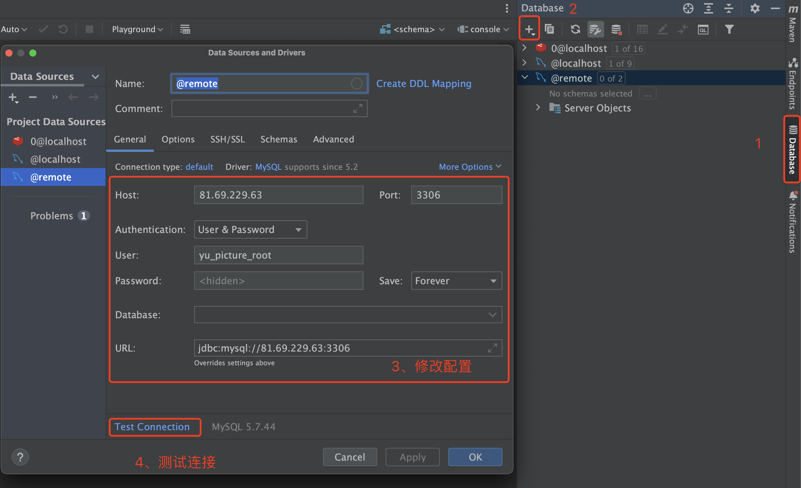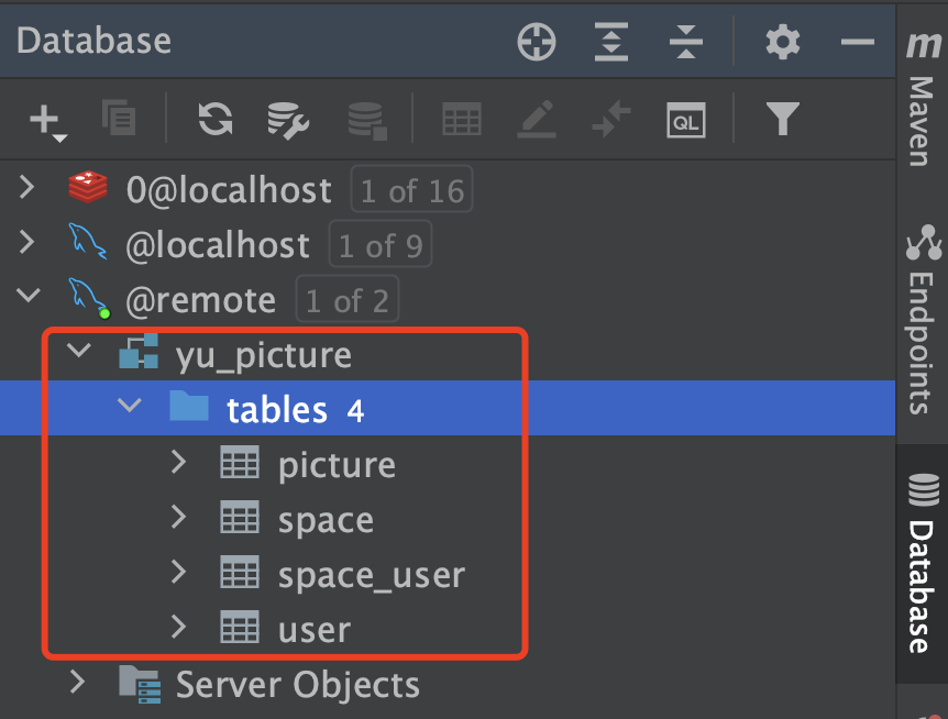 在 IDEA 中打开后端项目,通过数据库面板在本地检查连接是否正常: