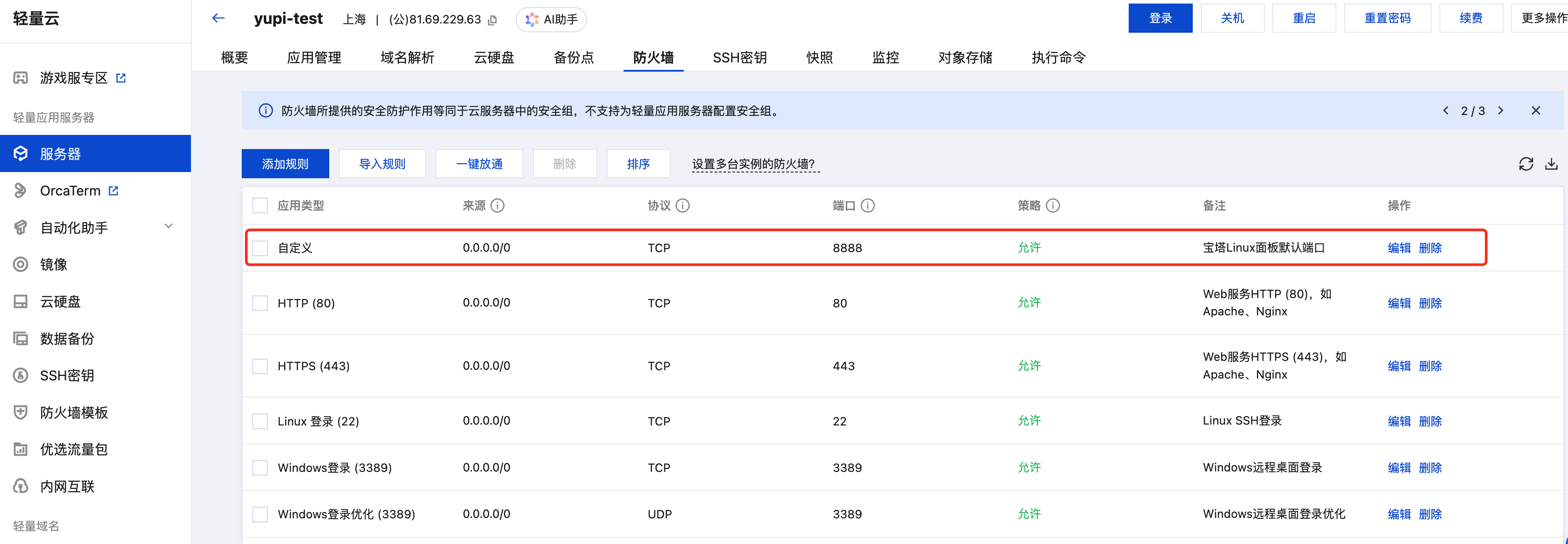 点击服务器进入详情页,在防火墙标签页中放通 8888 宝塔面板端口,否则无法在自己的电脑上访问宝塔。