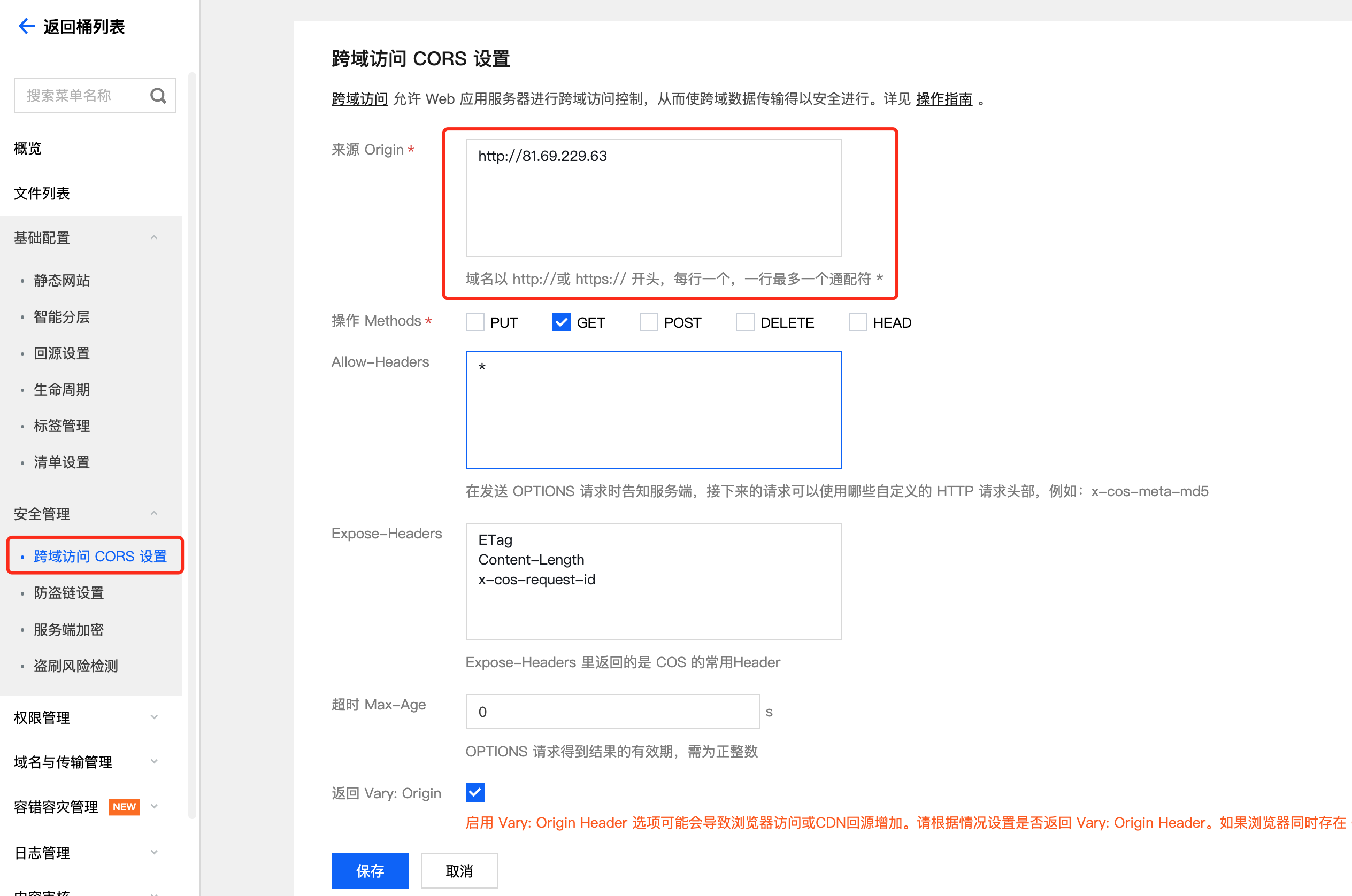 注意,要给对象存储增加该服务器 IP(或者实际访问前端域名)的跨域配置,否则编辑图片时将无法正确加载图片。