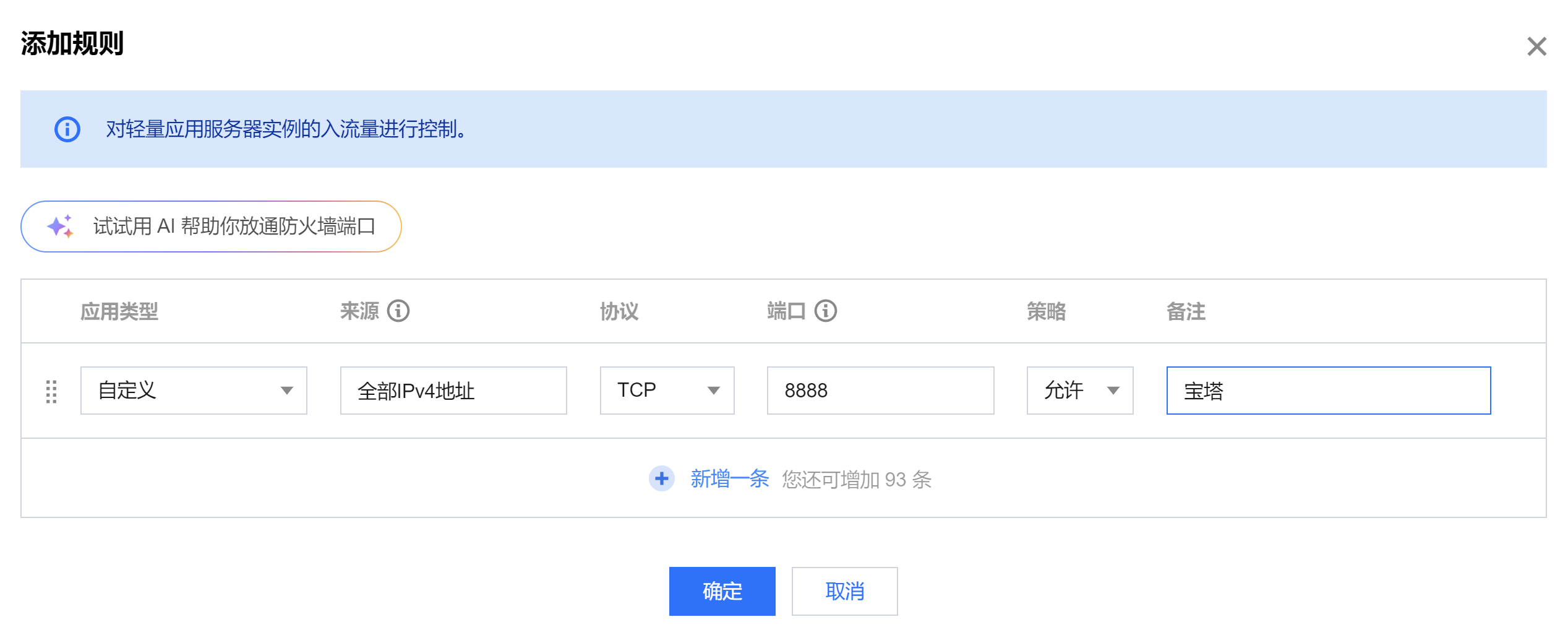 新版本的轻量应用服务器已经自动为我们放通该端口。否则需要手动新增一条防火墙规则:
