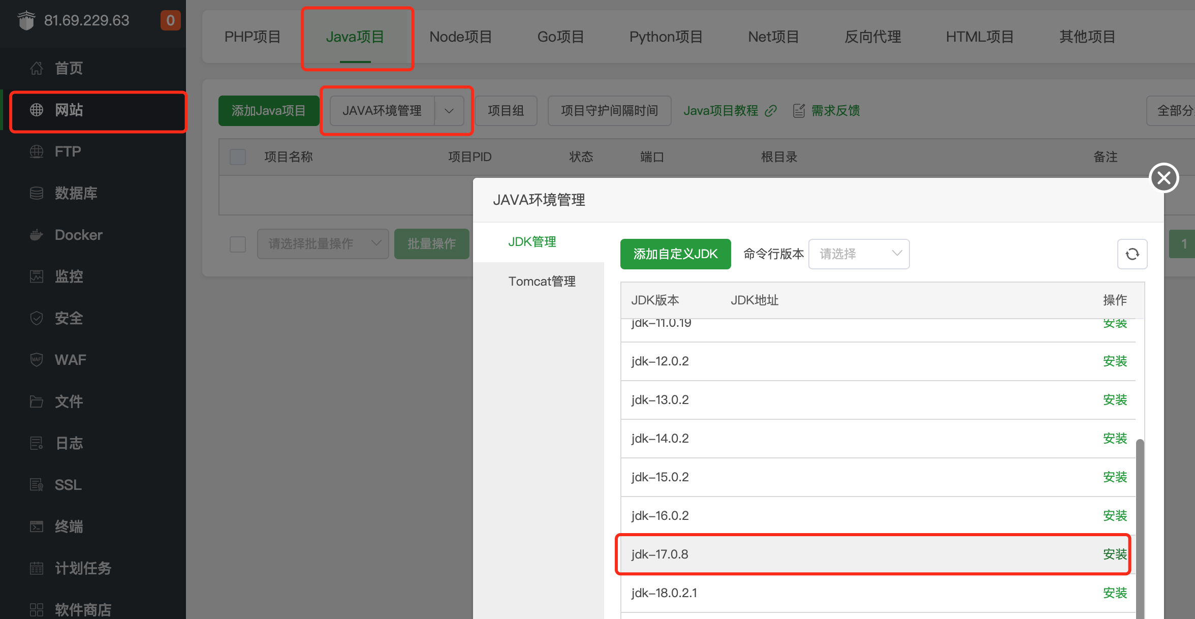 要部署 Java 项目,必须安装 JDK。在宝塔面板中,可以通过下图的方式快速安装指定版本的 JDK。此处我们先安装 JDK 17: