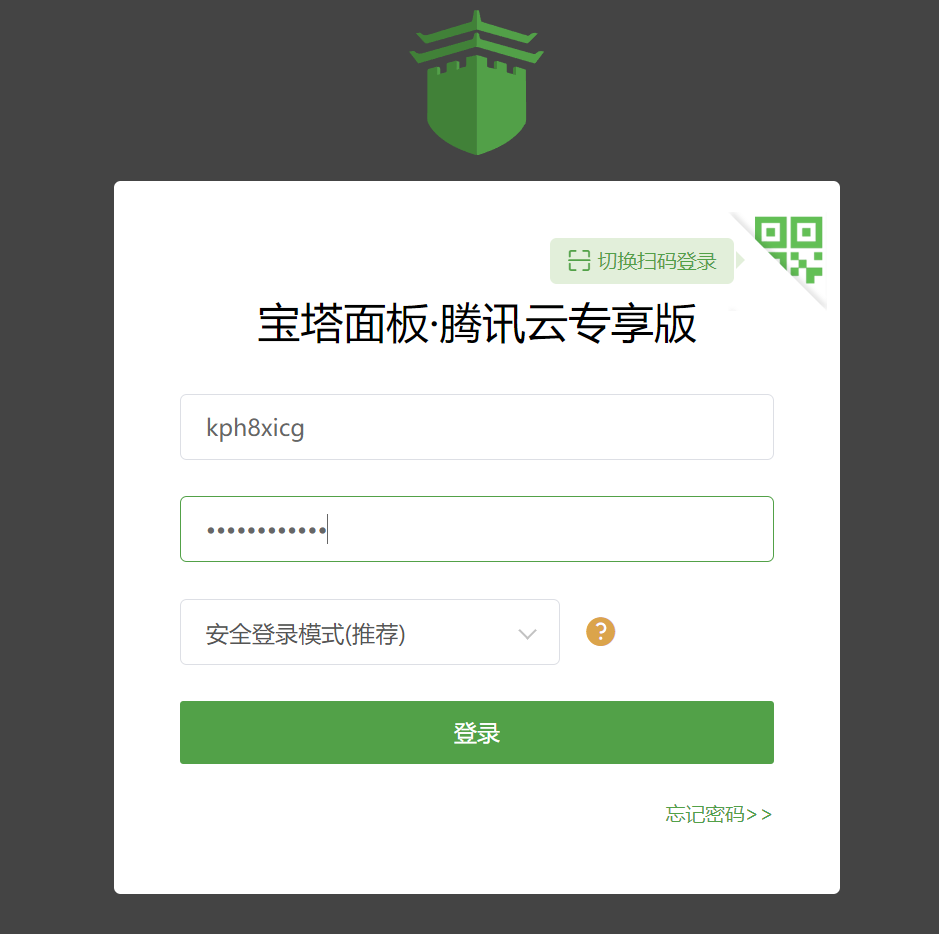 根据终端输出的信息,访问宝塔面板,输入初始用户名和密码: