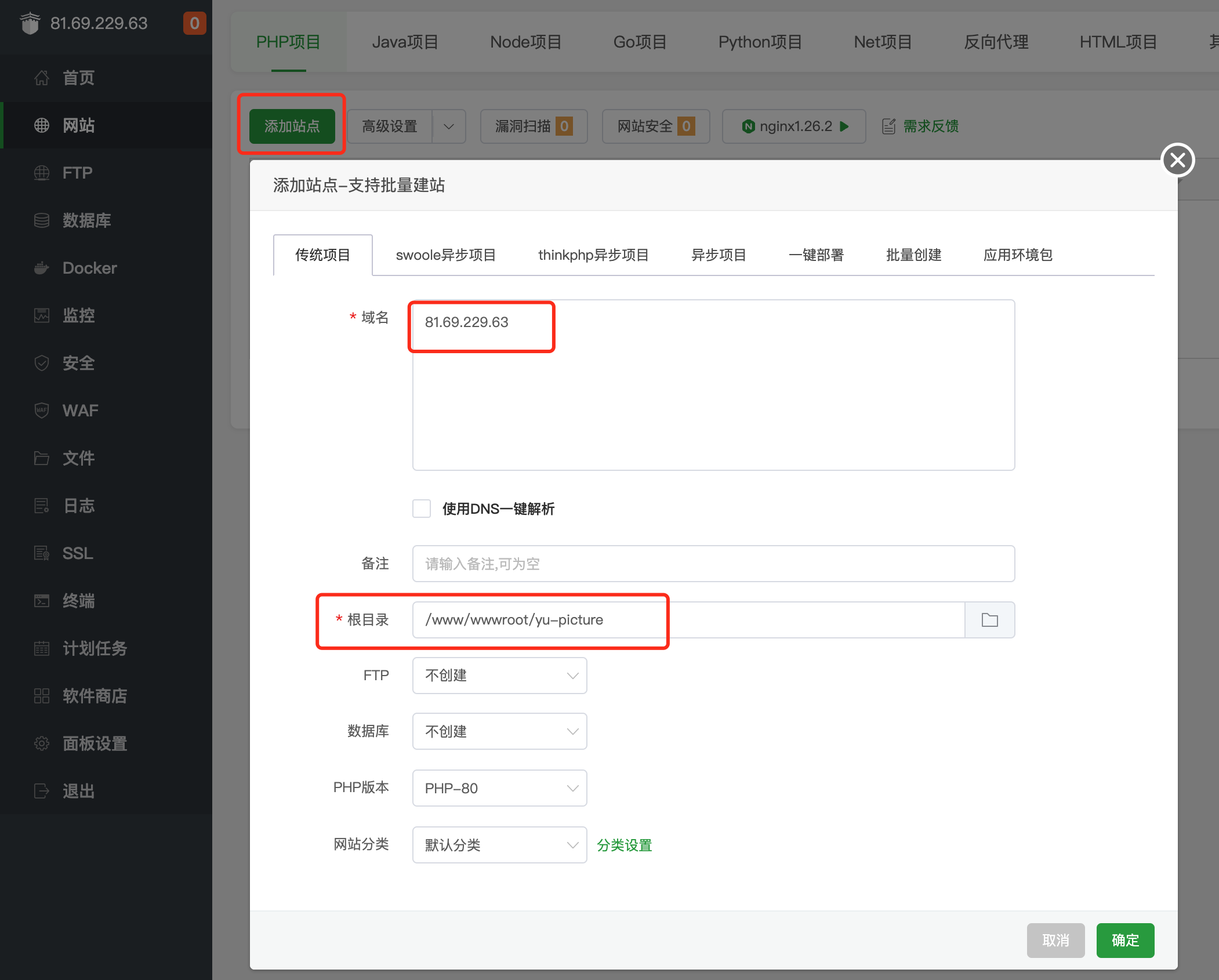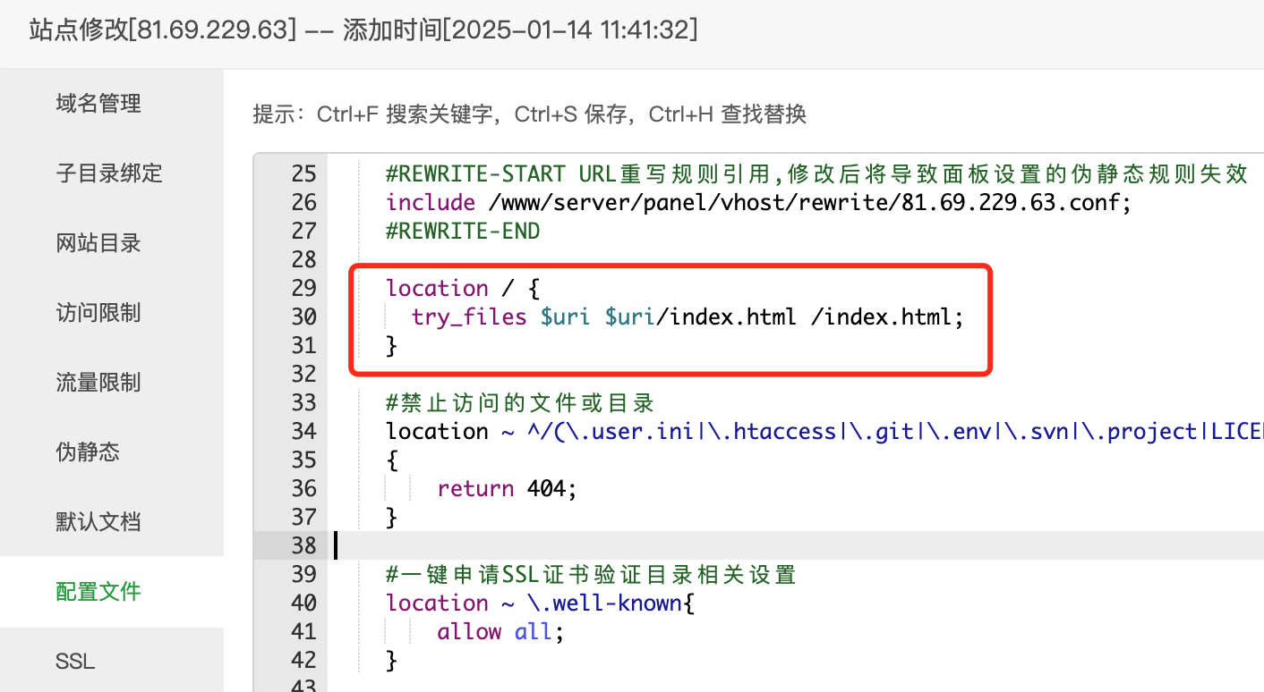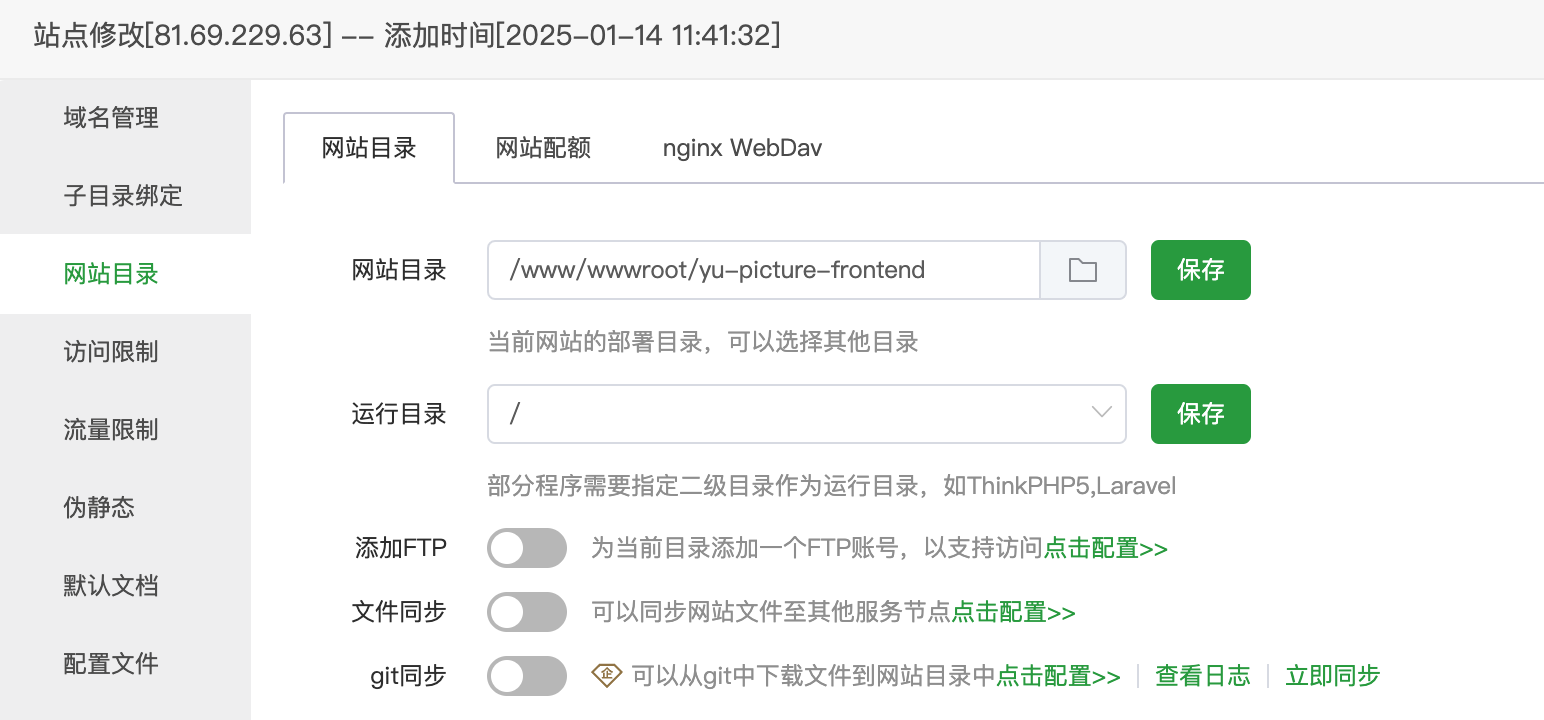 修改已有站点的网站目录配置,指向前端文件根目录: