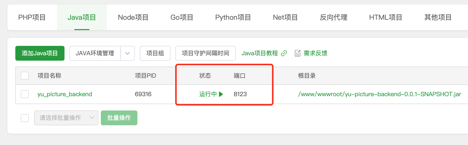 涉及到具体的部署方式,前端要遵循 Vue 项目的部署模式,基于 Nginx 运行;后端可以直接利用宝塔的 Java 项目管理器运行 jar 包。