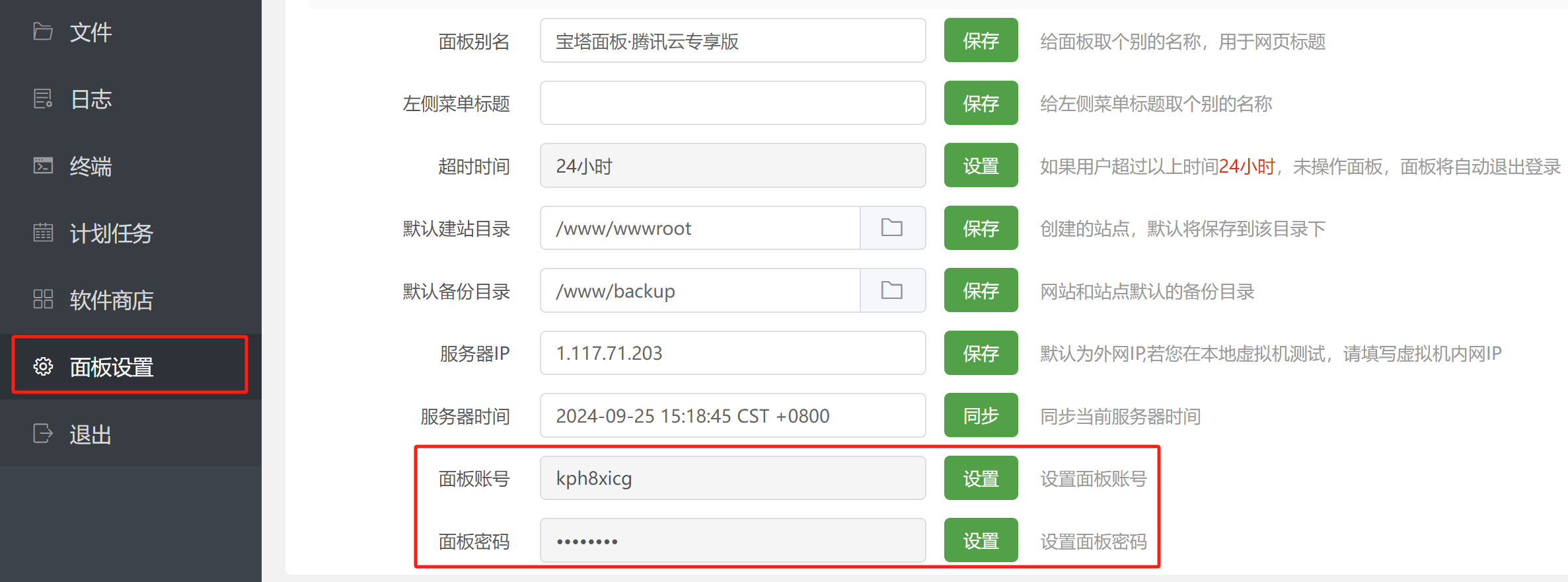 首次进入宝塔面板时,记得修改面板账号密码(每次修改完都要重新登录):