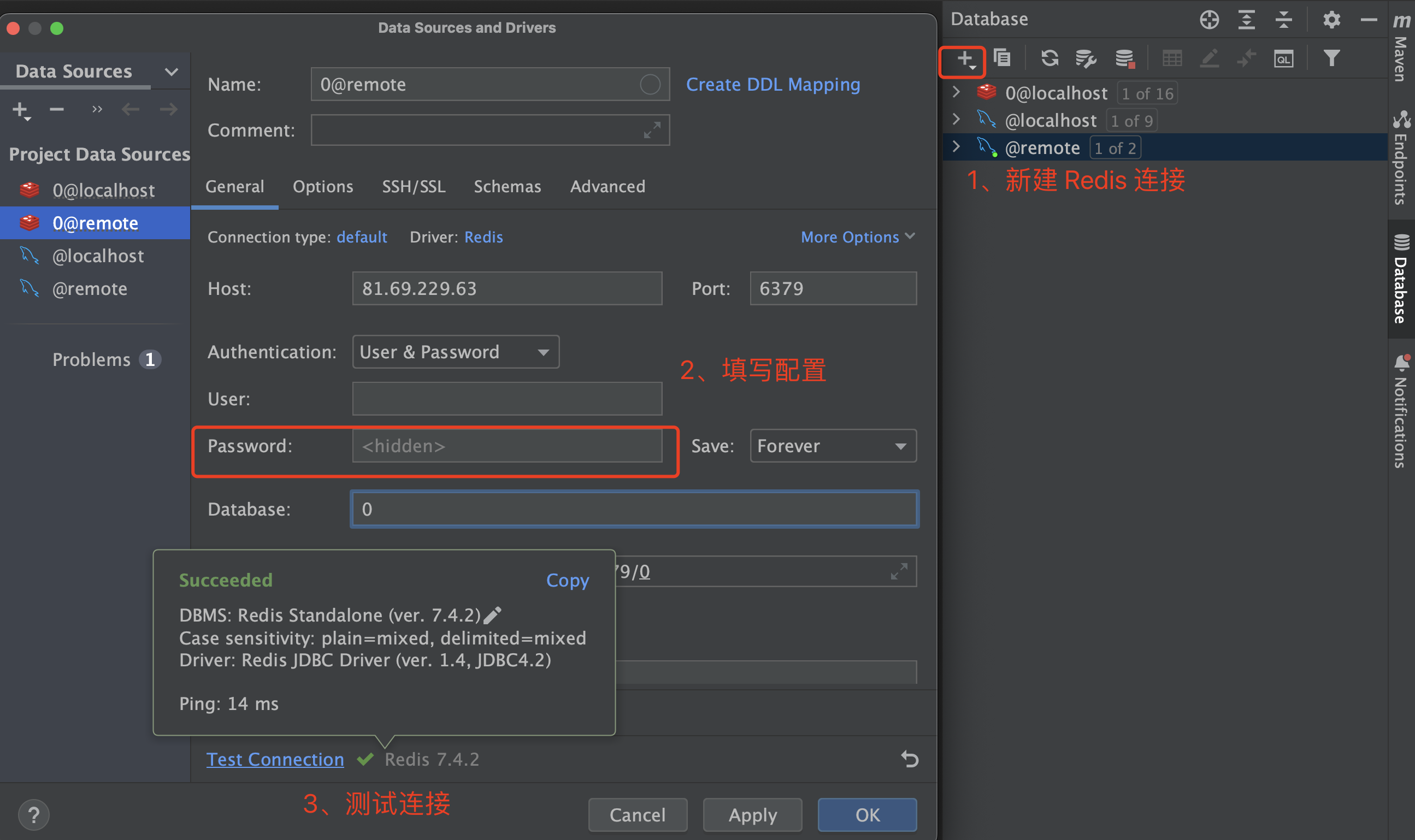 最后,在 IDEA 数据库面板中验证本地能否连接远程 Redis: