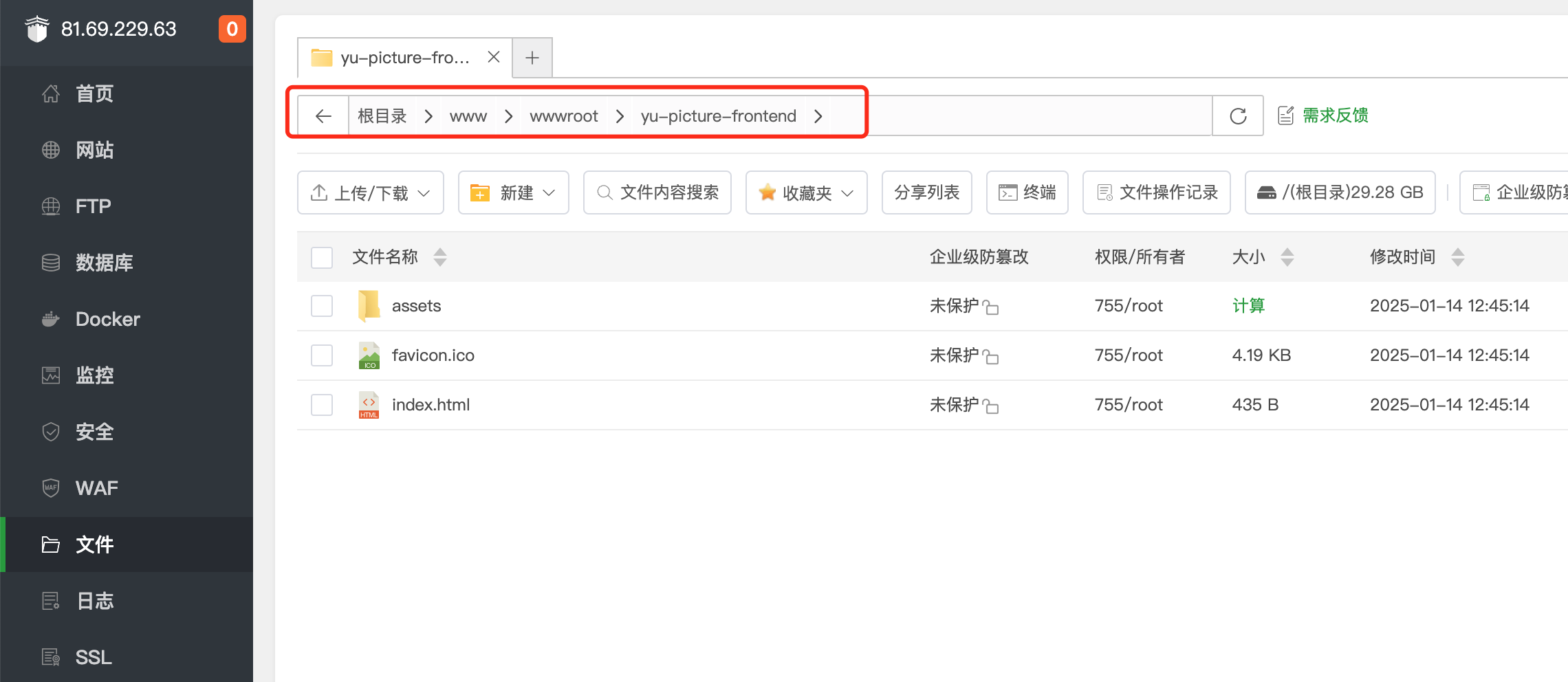 把 dist 目录下的所有文件上传到服务器上(可以新建一个 yu-picture-frontend 目录)。文件较多时,建议先在本地压缩,上传压缩包到服务器后再解压。如图: