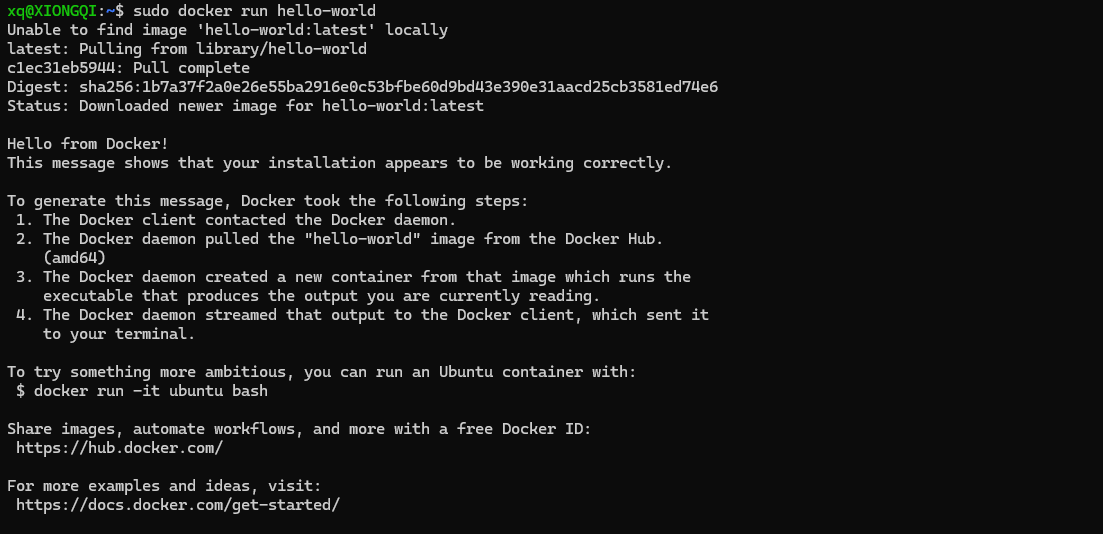 可以看到运行了docker info命令后终端输出了我们之前添加进去的docker源地址,这时候我们再次运行docker run hello-world便可以看到docker成功下载了对应的镜像并打印输出了“Hello from Docker!”