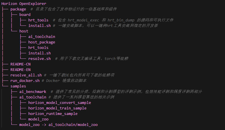 解压完成后我们进入OE包,可以看到我们的OE包的结构如下,分为两个大的文件夹package和samples,package里面主要是RDK系列的板端以及宿主机端的开发环境,由于我们使用的Docker镜像因此这个文件夹我们可以不用管我们主要来看看samples包叭,samples下面分为了三个文件夹,其中第三个model zoo是第二个文件夹里面ai_toolchain/model_zoo的软链接,第一个文件夹ai_benchmark是地瓜官方提供AI基准测试样例包,用于评估分类、检测和分割模型的性能和精度支持单帧延迟和双核多线程调度性能评估,通过这个包我们可以评估模型是否满足性能要求以及验证量化后的模型精度,但是一般来说如果我们使用Yolo系列的官版架构不微调的话这部分我们可以不用太过于在意