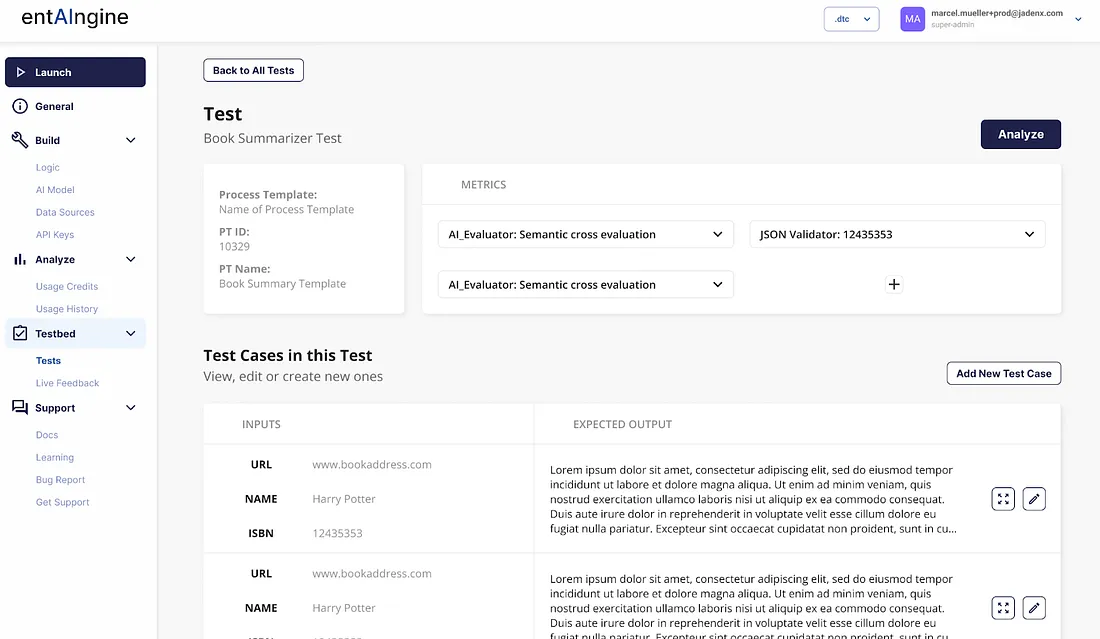 在测试屏幕中,用户可以创建新的评估场景或编辑现有的评估场景。在创建新的评估场景时,必须定义协调(entAIngine流程模板)和一组度量标准。我们假设有一个客户支持场景,其中我们需要通过RAG来检索数据,以在第一步回答一个问题,然后在第二步编写答复邮件。接着,我们使用新模块来命名测试,定义/选择流程模板,并选择一个评估者来为每个单独的测试用例生成分数。