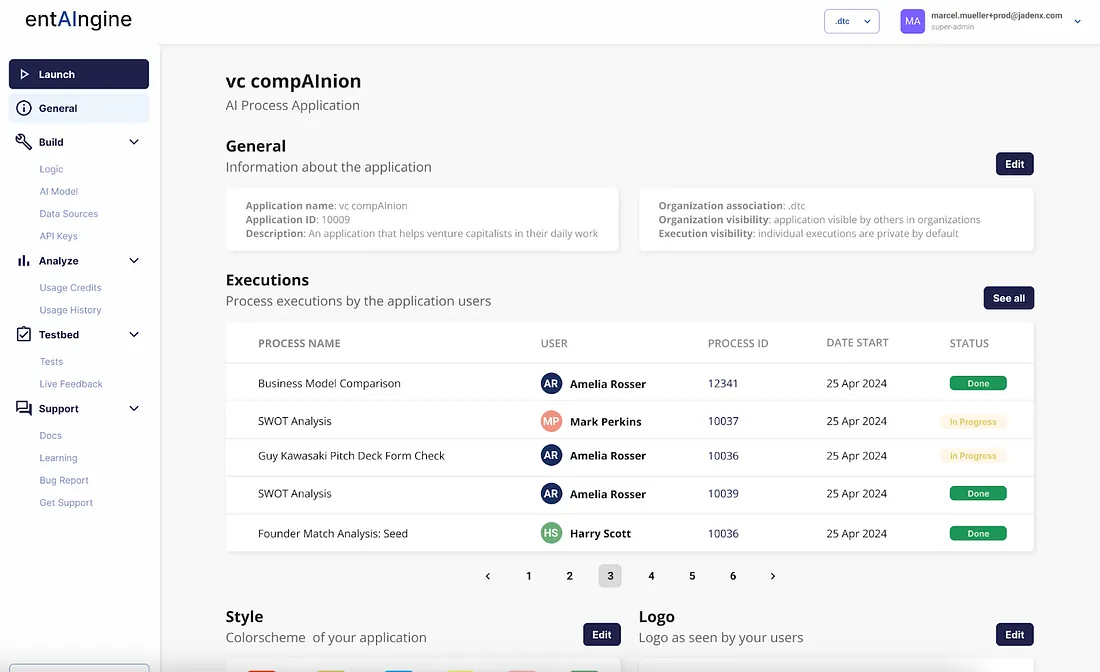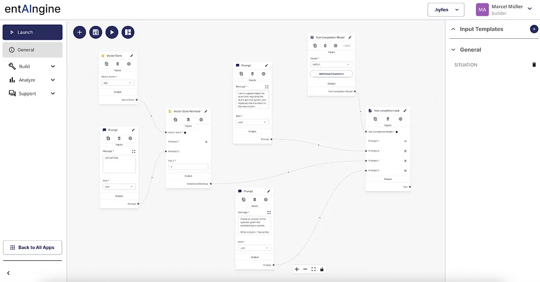 在entAIngine中,用户可以创建多种不同的应用程序。每个应用程序都是一组定义工作流的流程,这些流程使用无代码接口。流程由输入模板(变量)、RAG组件、LLM调用、TTS、图像和音频模块、文档集成和OCR组成。通过这些组件,我们构建可重复使用的流程,这些流程可以通过API集成、用作聊天流程、在文本编辑器中作为动态文本生成块使用,或在显示答案来源的知识管理搜索界面中使用。目前,这一功能已经在entAIngine平台上完全实现,并可以作为SaaS或100%部署在本地使用。它通过API与现有的网关、数据源和模型进行集成。我们将使用流程模板生成器来定义评估场景。