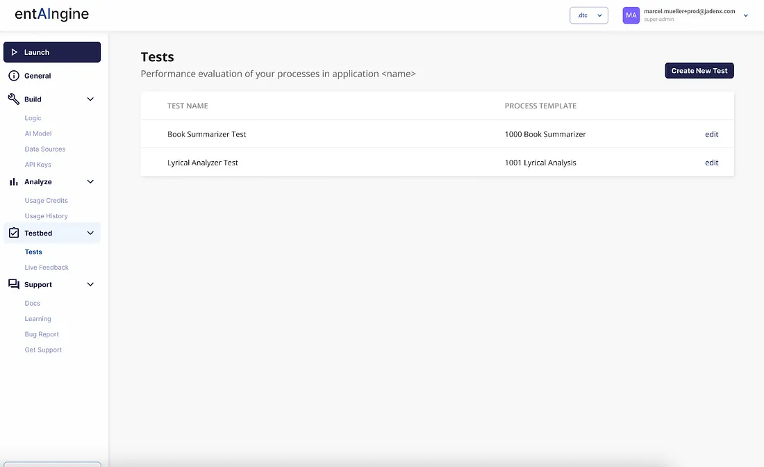 我们将评估场景和评估场景定义的概念映射到经典的软件测试概念中。创建新测试的起点是通过entAIngine应用程序仪表板。