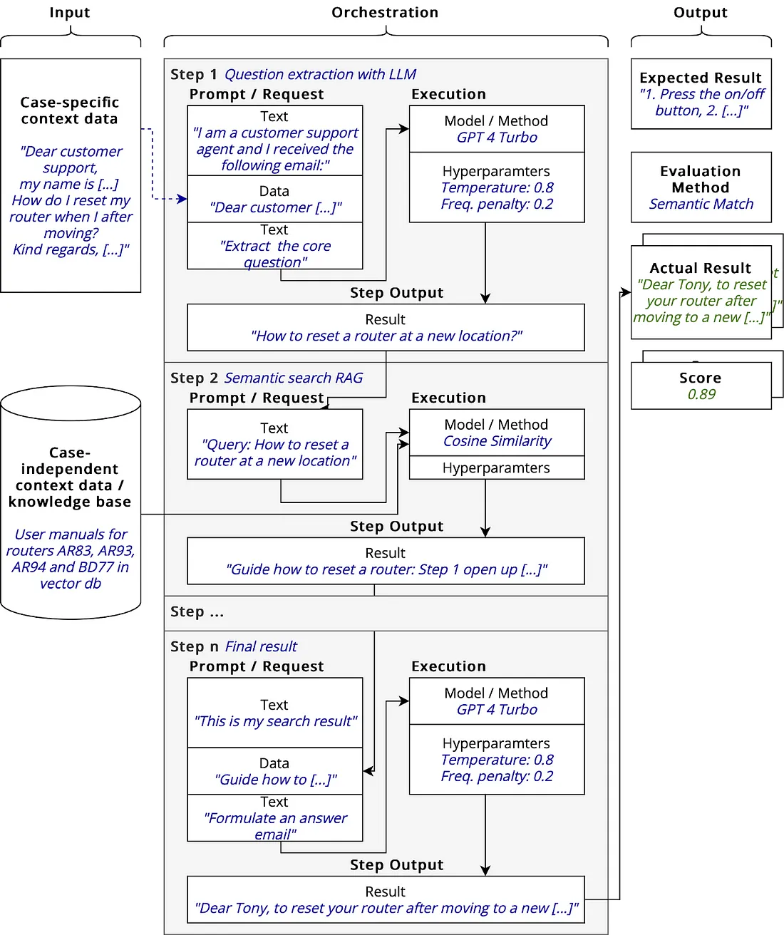 在我们的示例中,我们有一个三步的协调。在步骤1中,我们从特定案例的输入上下文(客户的电子邮件询问)中提取一个问题。我们在步骤2中使用这个问题,通过余弦相似度度量,在我们的向量数据库中创建一个语义搜索查询。最后一步将检索结果并使用LLM编写电子邮件。
