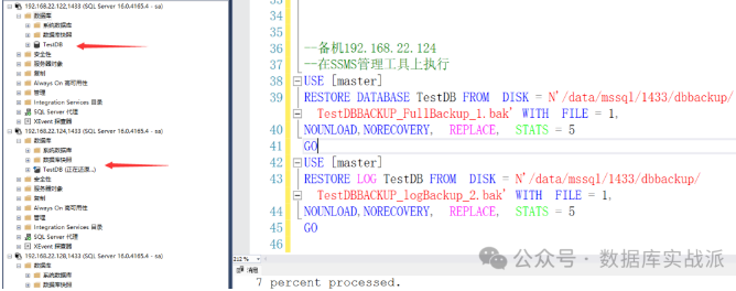 9. 还原数据库(指定norecovery方式还原)在备机执行