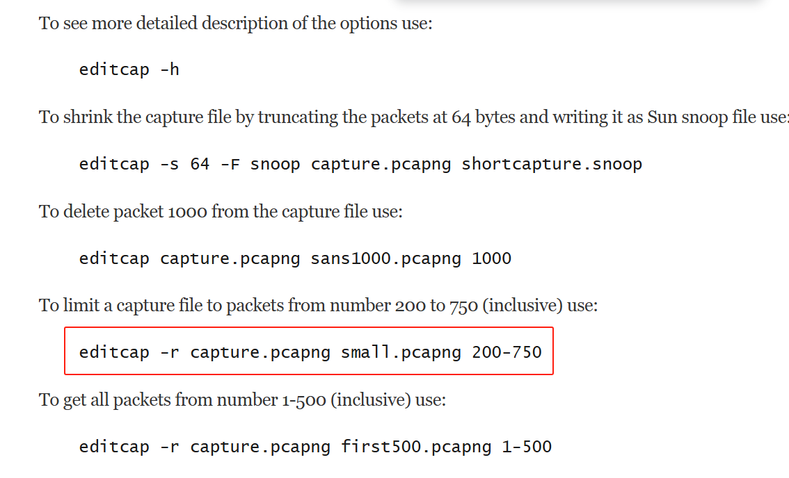 To limit a capture file to packets from number 200 to 750 (inclusive) use: