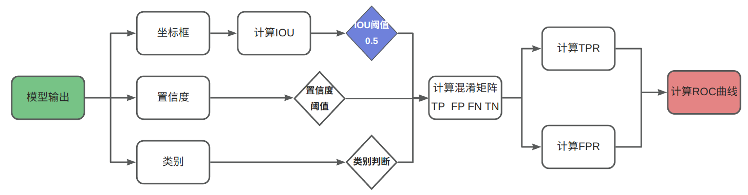 曲线绘制:每一个预测结果都有三个值:坐标框、置信度、类别,预测结果可以计算出TP、FP、FN、TN等混淆矩阵,进一步计算出TPR和FPR。也就是说每一个坐标框、置信度、类别都有一个对应的TPR和FPR的值。即一个置信度会得到一个TPR和一个FPR,通常IOU是一个固定值,类别也固定,也就是置信度->(TPR, FPR)。