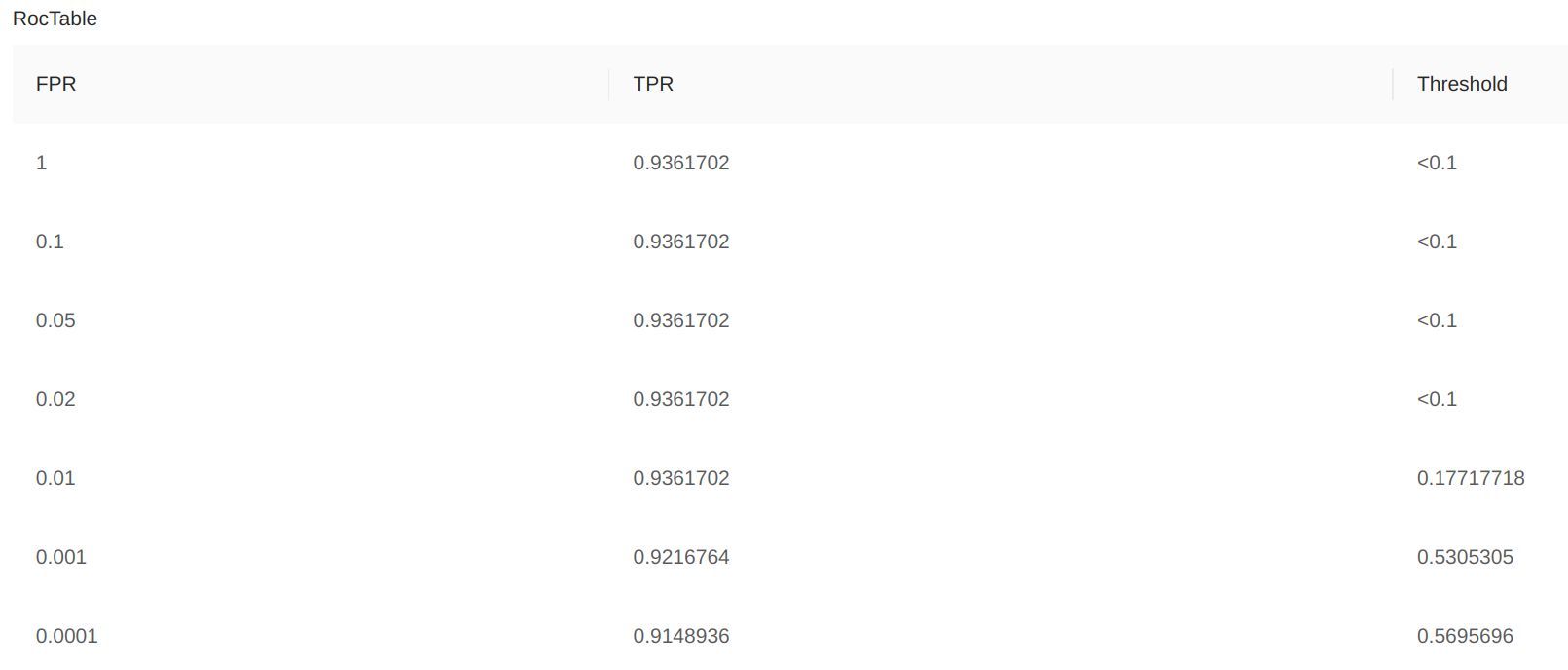 进一步为了方便查看指标,检测工程代码中将误检率为0.1、0.01、0.001等值单独组成一张ROC表格