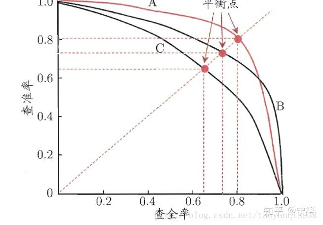 - 如果一个PR曲线被另一个PR曲线完全包住,则可断言后者的性能优于前者,例如上面的A和B优于C。但是A和B的性能无法直接判断