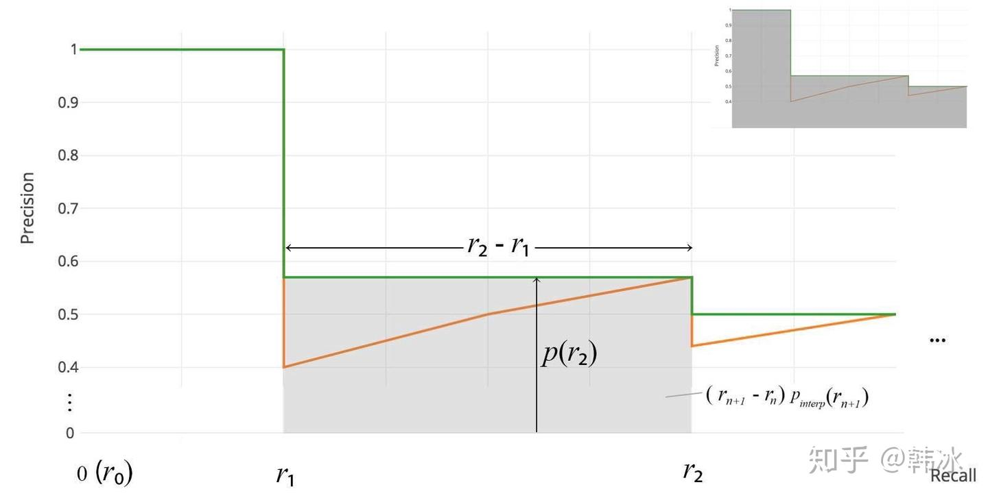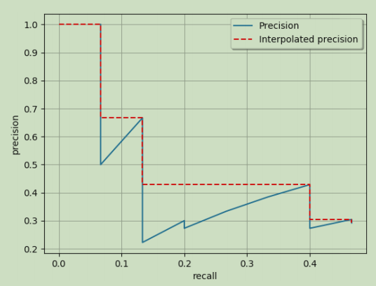 在Pascal voc 2010之后,便开始采用这种精度更高的方式。绘制出平滑后的PR曲线后,用积分的方式计算平滑曲线下方的面积作为最终的AP值。