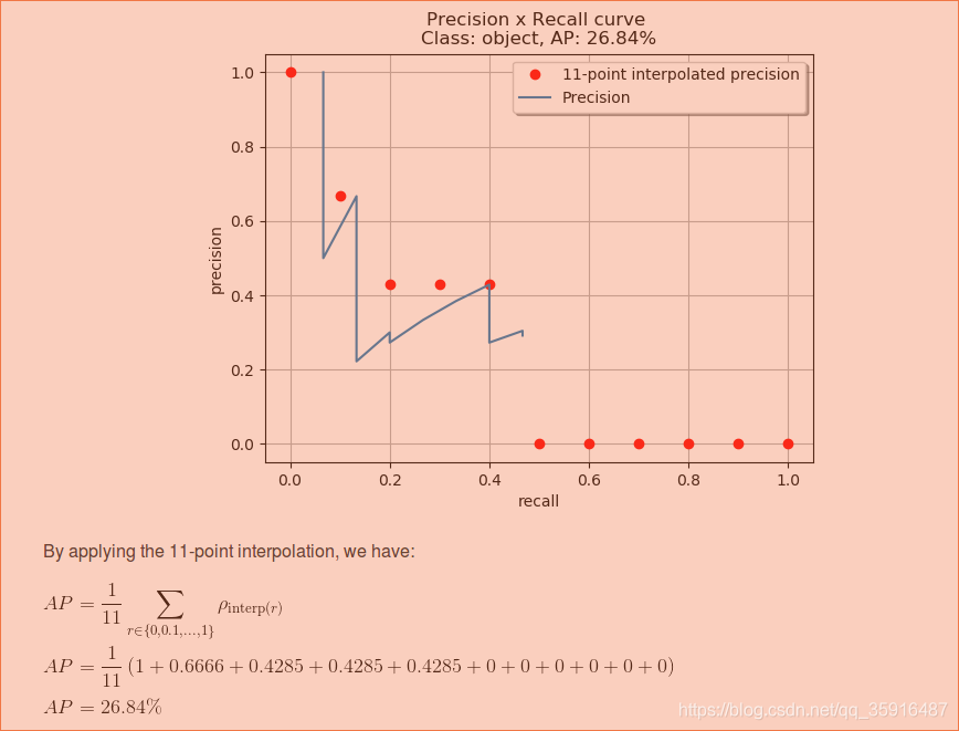 在平滑处理的PR曲线上,取横轴0-1的10等分点(包括断点共11个点)的Precision的值,计算其平均值为最终AP的值。