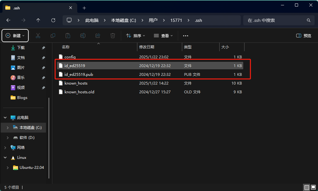 然后我们可以发现我们C盘的用户文件夹下的.ssh文件夹里面便会生成我们的密钥id_rsa为私钥,id_rsa.pub为公钥