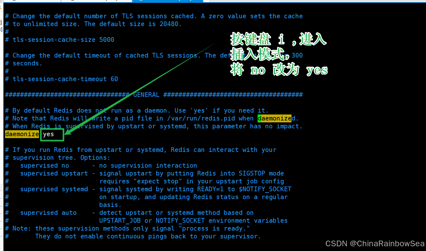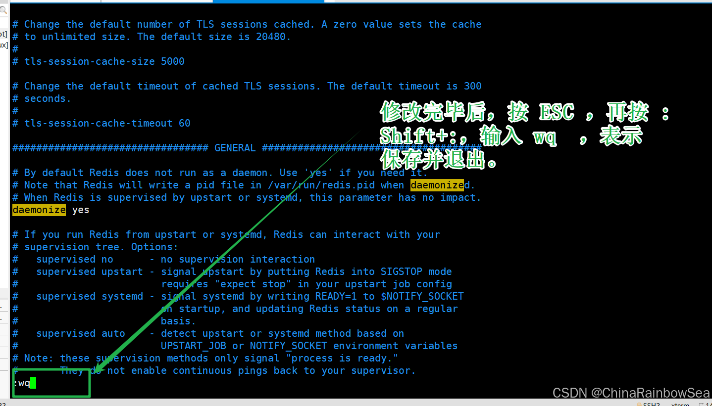daemonize no改成yes,表示让 Reids 可以在后台运行,而不是,退出了 Redis ,Reids 服务就退出了。(Reids 有两个,一个是 Reids 客户端,一个是 Redis 服务。Reids 客户端退出了,Reids 服务不一定要退出)。修改完毕后,按 ESC ,再按 : Shift+:,输入 wq ,表示 保存并退出。