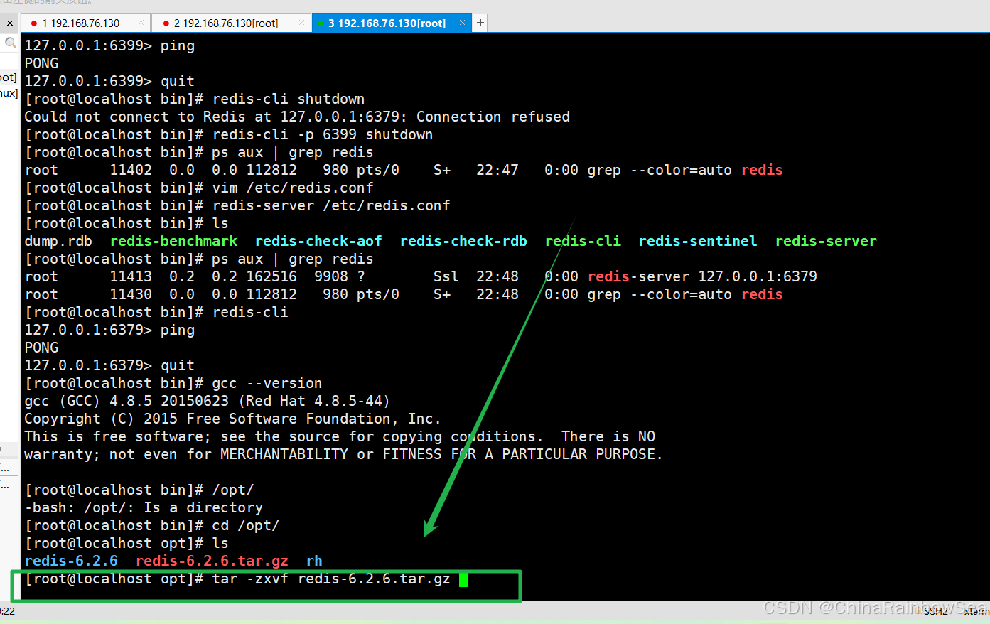 tar -zxvf redis-6.2.6.tar.gz将 redis 安装包进行一个解压。(注意:一定要进入到你放置 redis 安装包的目录当中才行)。[root@localhost opt]# tar -zxvf redis-6.2.6.tar.gz